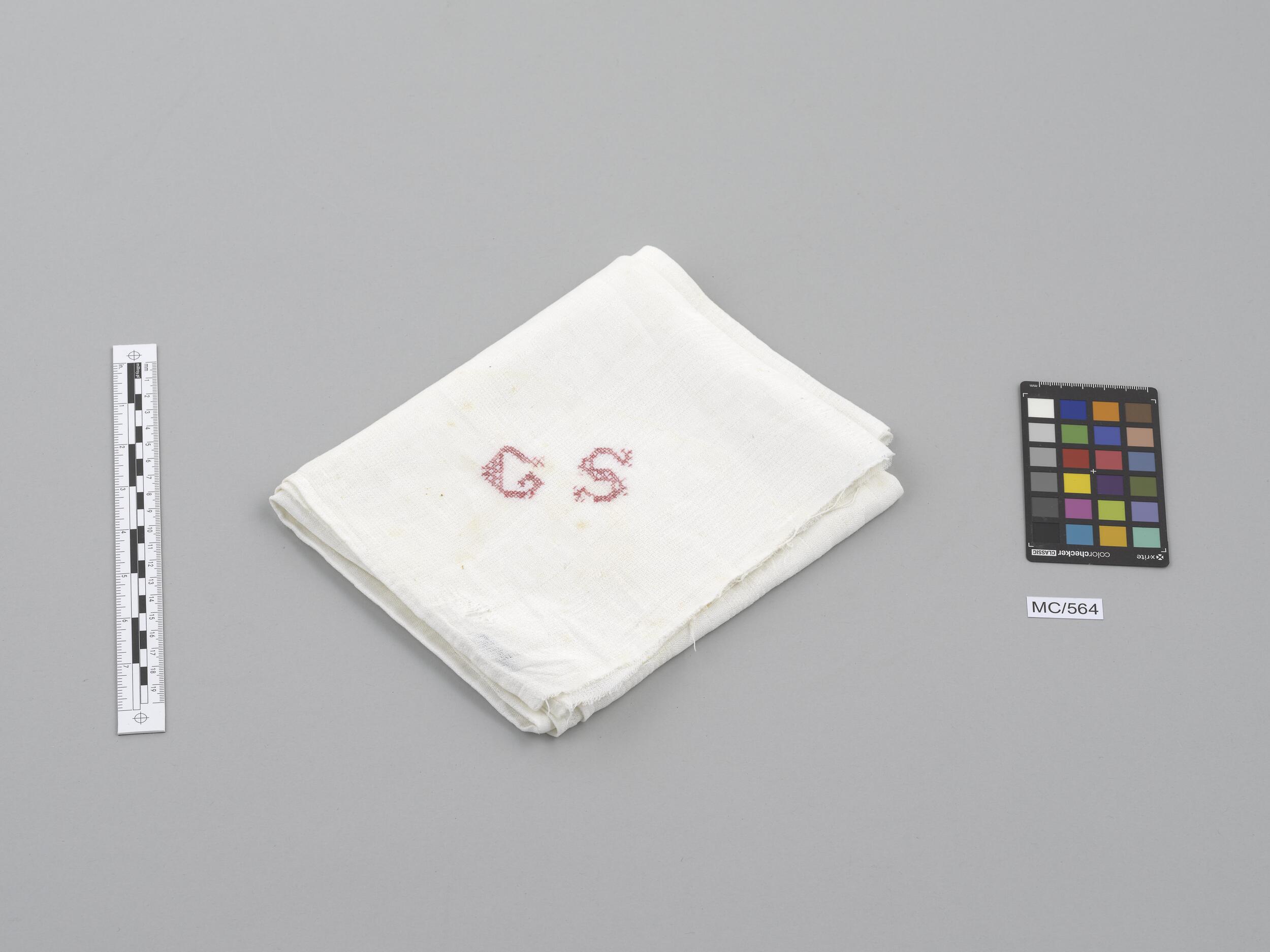Serweta z inicjałami „GS” wyszytymi czerwoną nicią