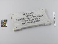 Czesław Kubicki, Tablica upamiętniająca przywiezienie serca Fryderyka Chopina do Warszawy z kościoła Św. Krzyża w Warszawie, tablica marmurowa i metalowe gwoździe, 1948/1949., Towarzystwo imienia Fryderyka Chopina (Warszawa) AUTH17