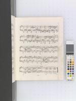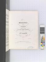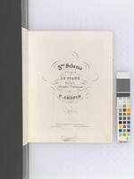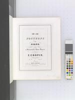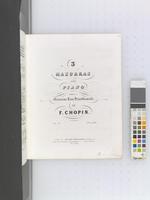 Zbiór pierwodruków i późniejszych nakładów pierwszych wydań utworów Fryderyka Chopina połączonych oprawą introligatorską, z adnotacjami rękopiśmiennymi, tom III (adnotacje ręką F. Chopina: [po 1840, przed 1849], oprawa oryginalna: [po 1850?] dopiski obcych rąk: [1849-50?], oprawa wtórna: 1967). Niegdyś własność Fryderyka Chopina [?], następnie jego siostry Ludwiki Jędrzejewiczowej., W tomie zgrupowane są wydania utworów Fryderyka Chopina o numerach opusu: 38, 39, 40 nr 1-2, 41 nr 1-4, 42, 43 (niekompl.), Mazurek dla E. Gaillard bez nr opusu, 44, 45, 46, 47, 48 nr 1-2, 49, 50 nr 1-3, 51, 52, 54, 28 nr 1-12, 13-24. 11. Na odwrocie przedniej karty oprawy w prawym dolnym rogu wklejony fragment oryginalnej oprawy: ozdobny inicjał złocony "C." na brązowym tle o wzorze marmurkowym.