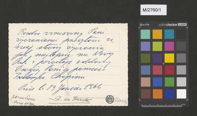 Pocztówka świąteczna Rogera de Garate'a do Ludwiki Ciechomskiej, „Bardzo wzruszony Pani życzeniami przesyłam ze swojej strony życzenia jak najlepsze na Nowy Rok”, syg.: „R. De Garate”, Paryż, 13/01/1964, s. 1., Pocztówka świąteczna, z życzeniami napisanymi po polsku, inną ręką, niż ręka nadawcy, z odręcznym podpisem Rogera de Garate'a.