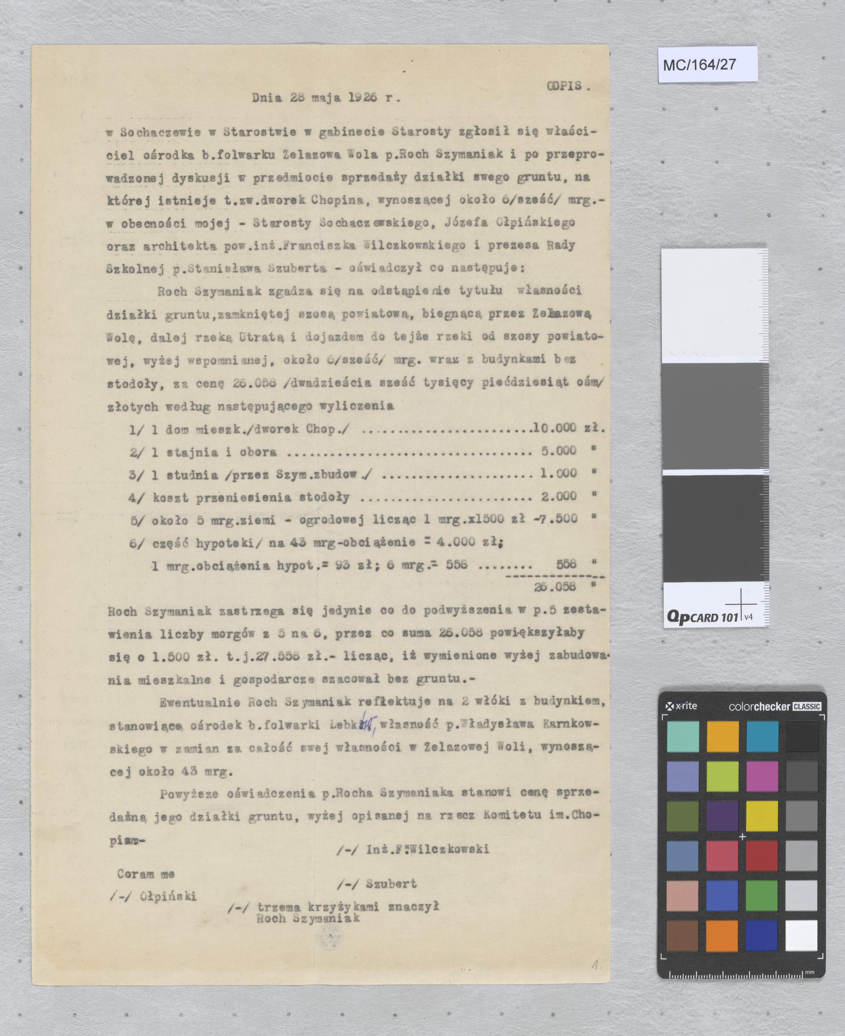 Zbiór dokumentów dotyczących wykupu z rąk prywatnych domu w Żelazowej Woli, w którym urodził się Fryderyk Chopin, wraz z gruntem