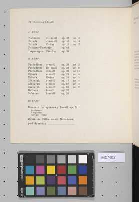 Towarzystwo im. Fryderyka Chopina, Biuro Wykonawcze Komitetu Roku Chopinowskiego 1960, Książka programowa VI Międzynarodowego Konkursu Pianistycznego im. Fryderyka Chopina, redakcja Kazimierz Czekaj, opracowanie graficzne Józef Mroszczak, Poznańskie Zakłady Graficzne im. Marcina Kasprzaka, 1960., W części centralnej przedniej okładziny oprawy nadruk: „1810 | PROGRAM |1960”. Na kartach wyklejkowych przednich reprodukcja litografii Maksymiliana Fajansa według rysunku Napoleona Ordy: „Żelazowa Wola”, na kartach wyklejkowych tylnych reprodukcja z widokiem Pałacu Staszica i fragmentu Krakowskiego Przedmieścia w Warszawie., Na obwolucie reprodukcja autografu Etiudy c-moll op. 25 nr 12 Fryderyka Chopina., W partiach wstępnych katalogu: spis instytucji sprawujących protektorat nad konkursem, spis osób wchodzących w skład Komitetu Roku Chopinowskiego 1960, skład Jury, spis uczestników, Regulamin Konkursu. Pozycje katalogu numerowane 1-86; zawierają repertuar konkursowy uczestników z podziałem na I, II i III etap, a także ich notki biograficzne i fotografie. Na zakładce tekst informacyjny o TiFC., Kwiecień, Sławomir AUTH1995