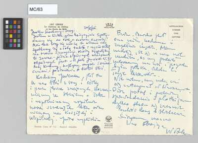 List Colette i Witolda Małcużyńskich z dopiskiem NN do Romany i Jerzego Waldenbergów na karcie pocztowej z widokiem jeziora Léman, zamku w Chillon i szczytów górskich les Dents du Midi w Szwajcarii, „Kochany Jureczku, jest tu | u nas Staś z żoną i córką [...]”, sygn.: „Witek”, „Jurku Kochany i Drogi. | Jestem u Witka, gdzie tradycyjnie spoty-|kamy się co rok [...]”, sygn.: „Staś”, [Le Pertit de Sonzier, Chernex s/Montreux, Szwajcaria], 20 sierpnia [19]66 roku, s. 2.