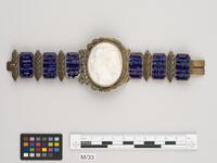 Autor nieznany, Bransoleta z kameą przedstawiającą profil Fryderyka Chopina na podstawie medalionu Jean-François-Antoine'a Bovy’ego z 1837, brąz, koral, emalia, po 1849., Na środku biała kamea, na której plaskorzeźbiony lewy profil Fryderyka Chopina, wokół ornament roślinny liści wawrzynu po prawej i owoców dębu [?] po lewej, po bokach po trzy ogniwa wypełnione niebieską emalią, na zmianę z ogniwami w kształcie prostej gałązki wawrzynu. Na polach emaliowanych napisy i zapisy nutowe z nazwami utworów., Instytut Fryderyka Chopina (Warszawa) AUTH826, Towarzystwo imienia Fryderyka Chopina (Warszawa) AUTH17