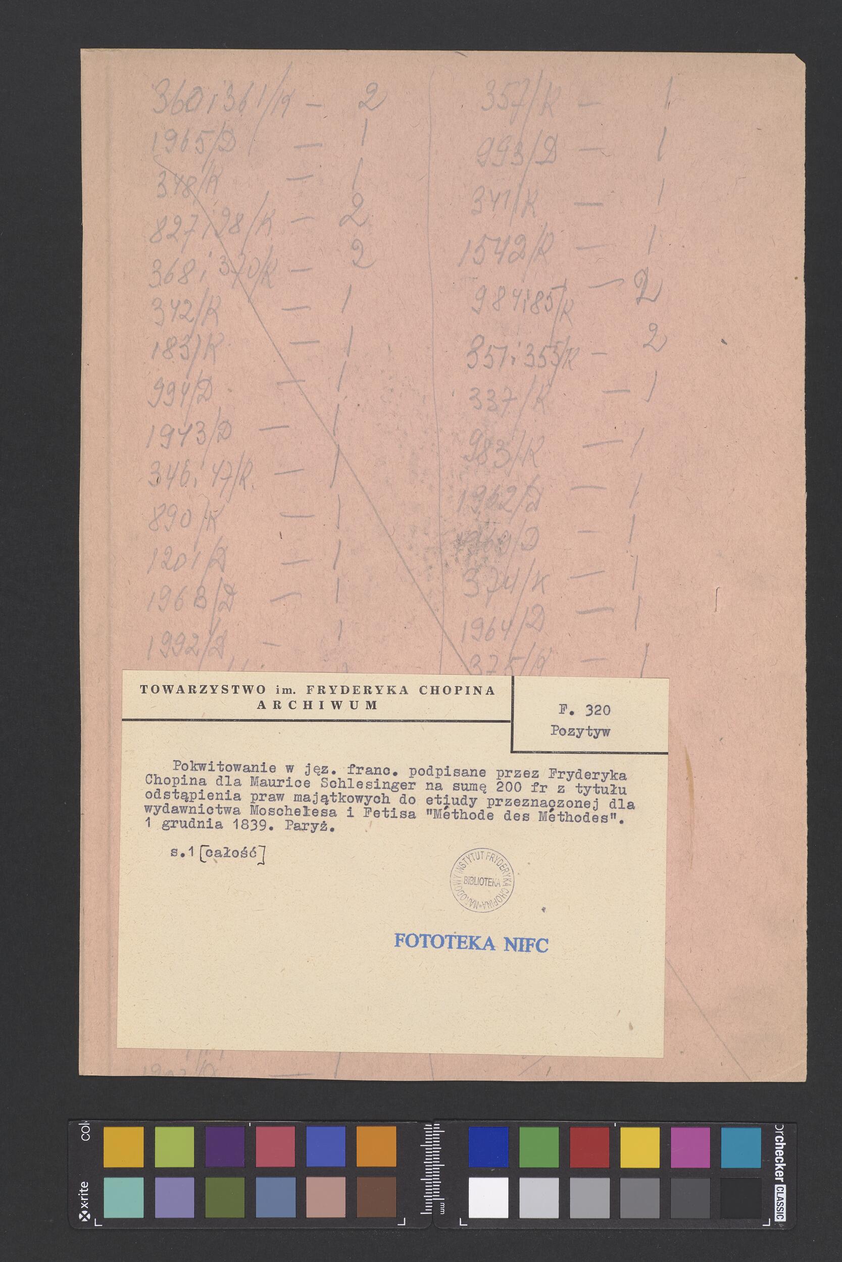 Pokwitowanie podpisane przez Fryderyka Chopina, potwierdzające sprzedaż oficynie Maurycego Schlesingera praw majątkowych do drugiej Etiudy z cyklu „Méthode des Méthodes des Pianistes” Fétisa i Moschelesa