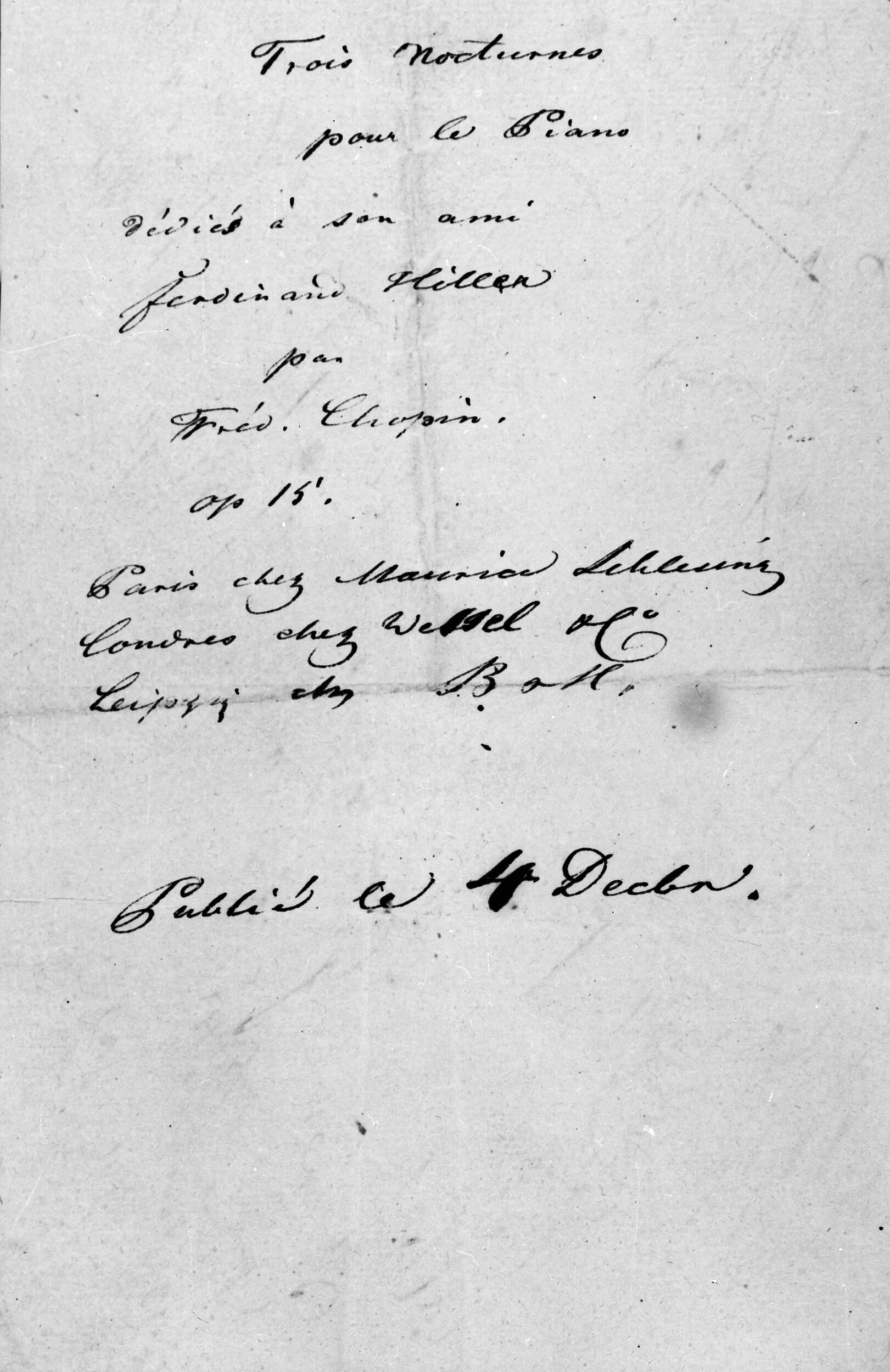 Pokwitowanie sporządzone przez Maurycego Schlesingera dla Heinricha Probsta, za sprzedaż na sumę 300 fr praw majątkowych do trzech Nokturnów op. 15 oraz Wariacji B-dur na temat ronda „Je vends des scapulaires” z opery „Ludovic” Herolda i Halevy'ego op. 12 Fryderyka Chopina (NEGATYWY)