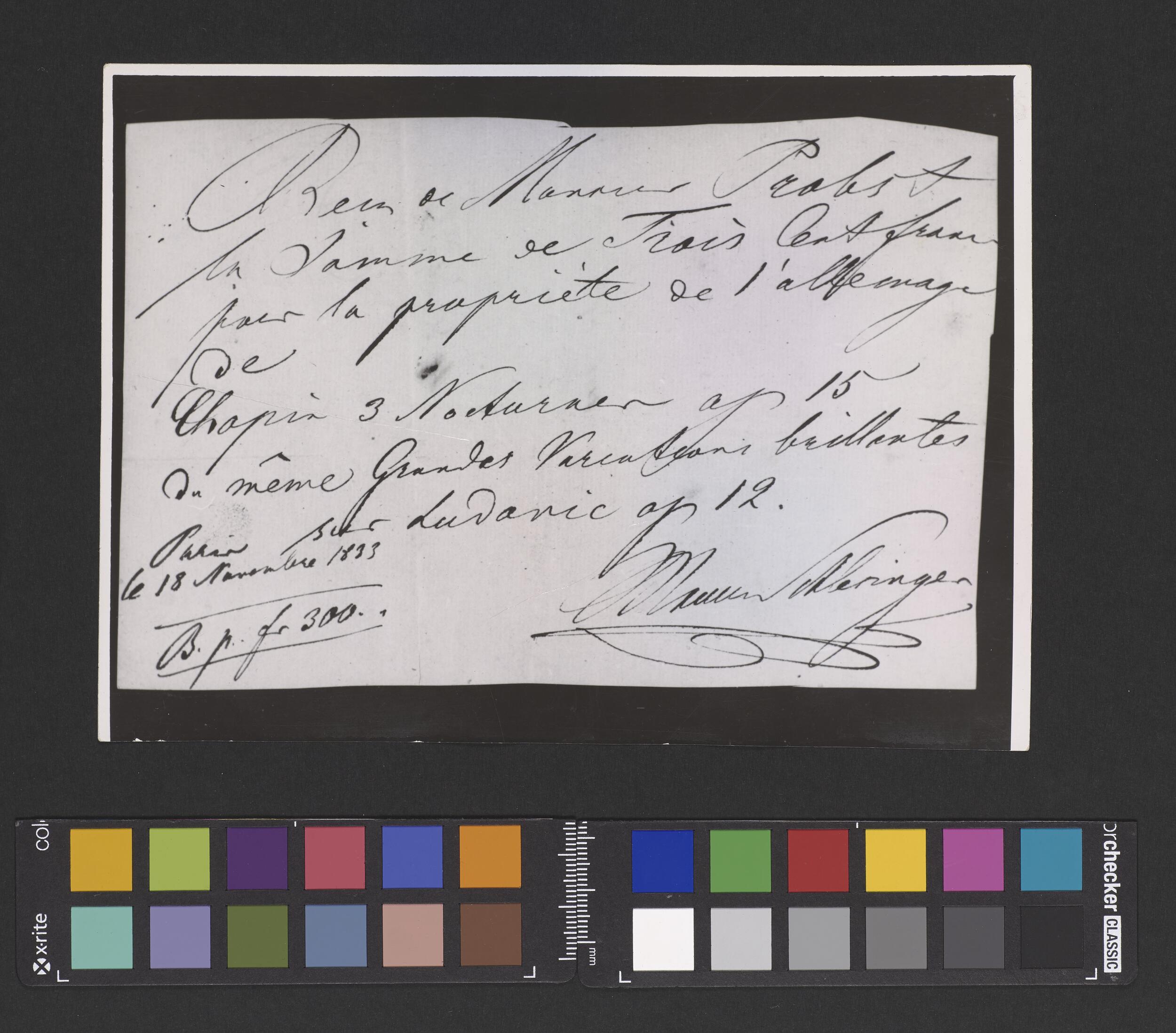 Pokwitowanie sporządzone przez Maurycego Schlesingera dla Heinricha Probsta, za sprzedaż na sumę 300 fr praw majątkowych do trzech Nokturnów op. 15 oraz Wariacji B-dur na temat ronda „Je vends des scapulaires” z opery „Ludovic” Herolda i Halevy'ego op. 12 Fryderyka Chopina (POZYTYWY I EGZ)