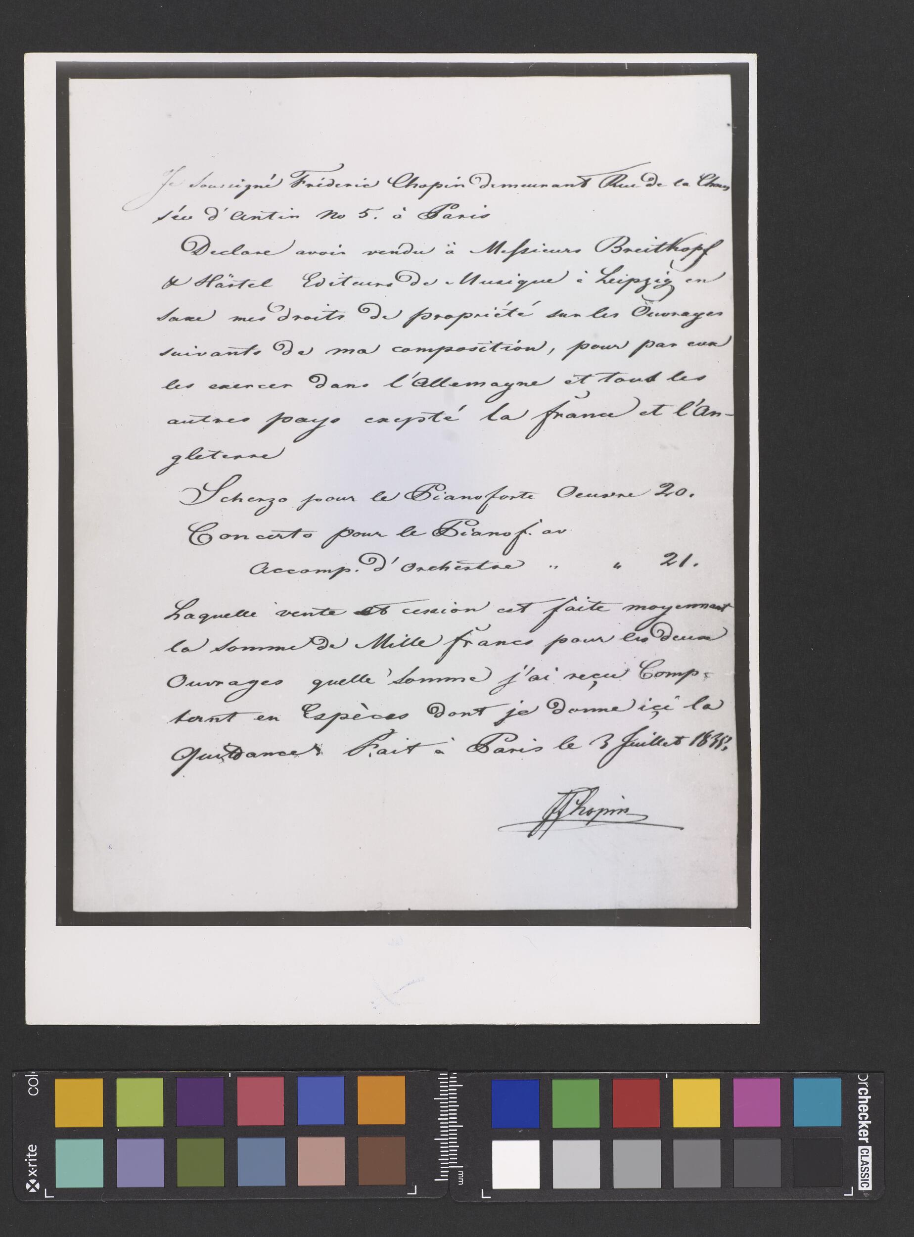 Zaświadczenie podpisane przez Fryderyka Chopina, potwierdzające sprzedaż firmie Breitkopf & Härtel praw majątkowych do Scherza b-moll op. 20 i Koncertu f-moll op. 21 z możliwością ich publikacji na terenie wszystkich krajów poza Francją i Anglią (POZYTYW III EGZ)