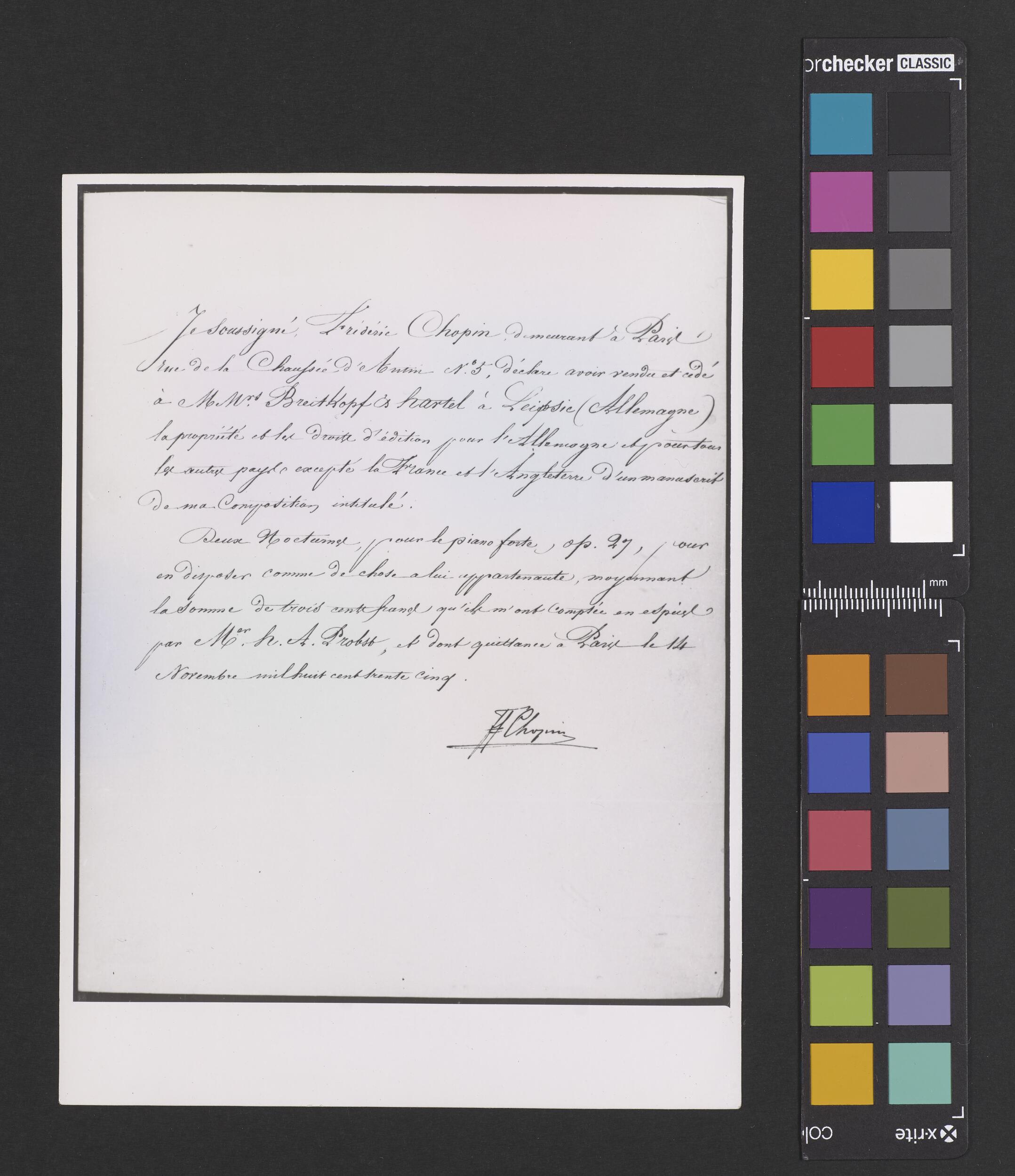 Zaświadczenie podpisane przez Fryderyka Chopina, potwierdzające sprzedaż firmie Breitkopf & Härtel praw majątkowych do dwóch Nokturnów op. 27 z możliwością ich publikacji na terenie wszystkich krajów poza Francją i Anglią (POZYTYW II EGZ)
