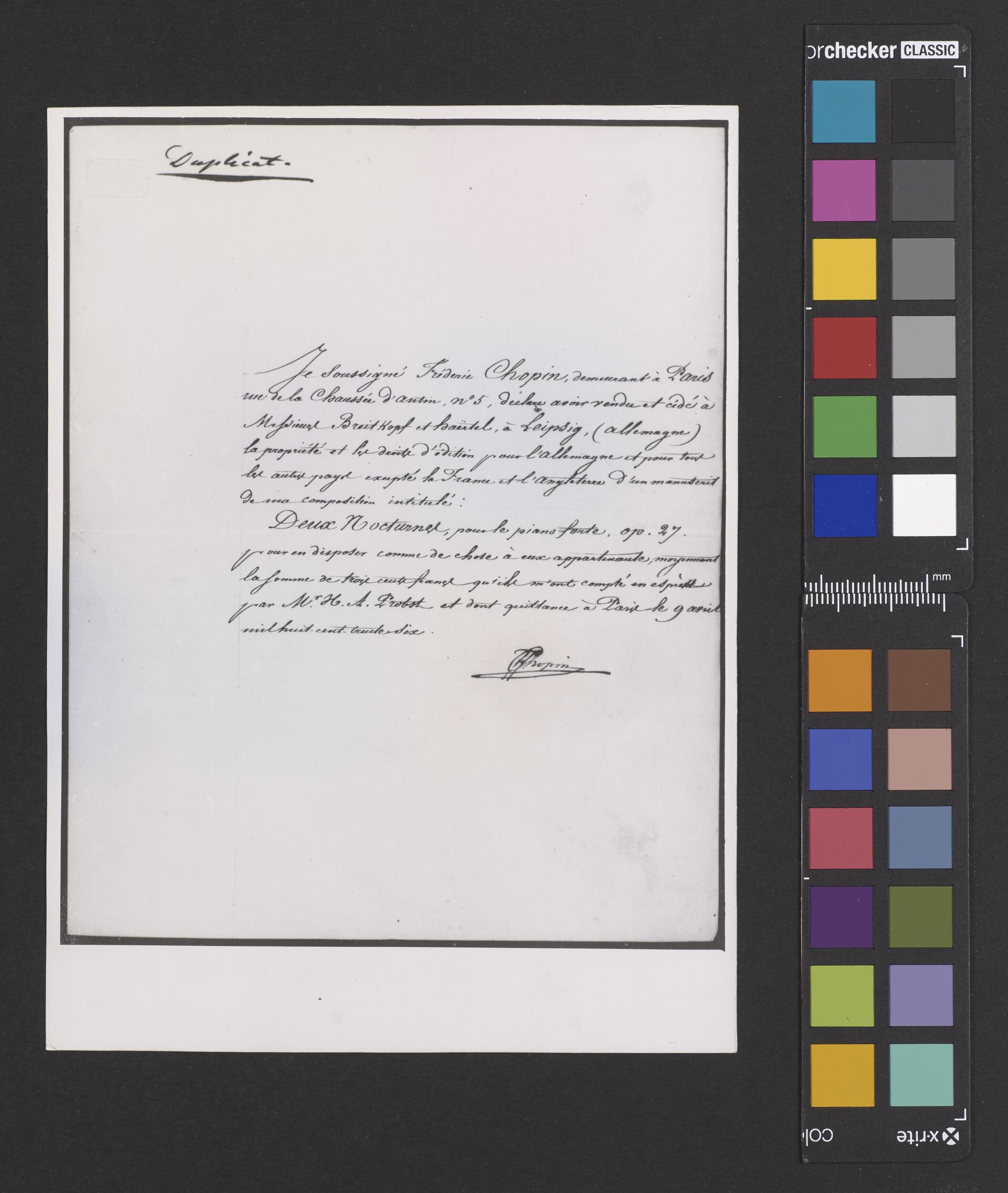 Duplikat zaświadczenia podpisanego przez Fryderyka Chopina, potwierdzającego sprzedaż firmie Breitkopf & Härtel praw majątkowych do dwóch Polonezów op. 26 z możliwością ich publikacji na terenie wszystkich krajów poza Francją i Anglią (POZYTYW II EGZ)