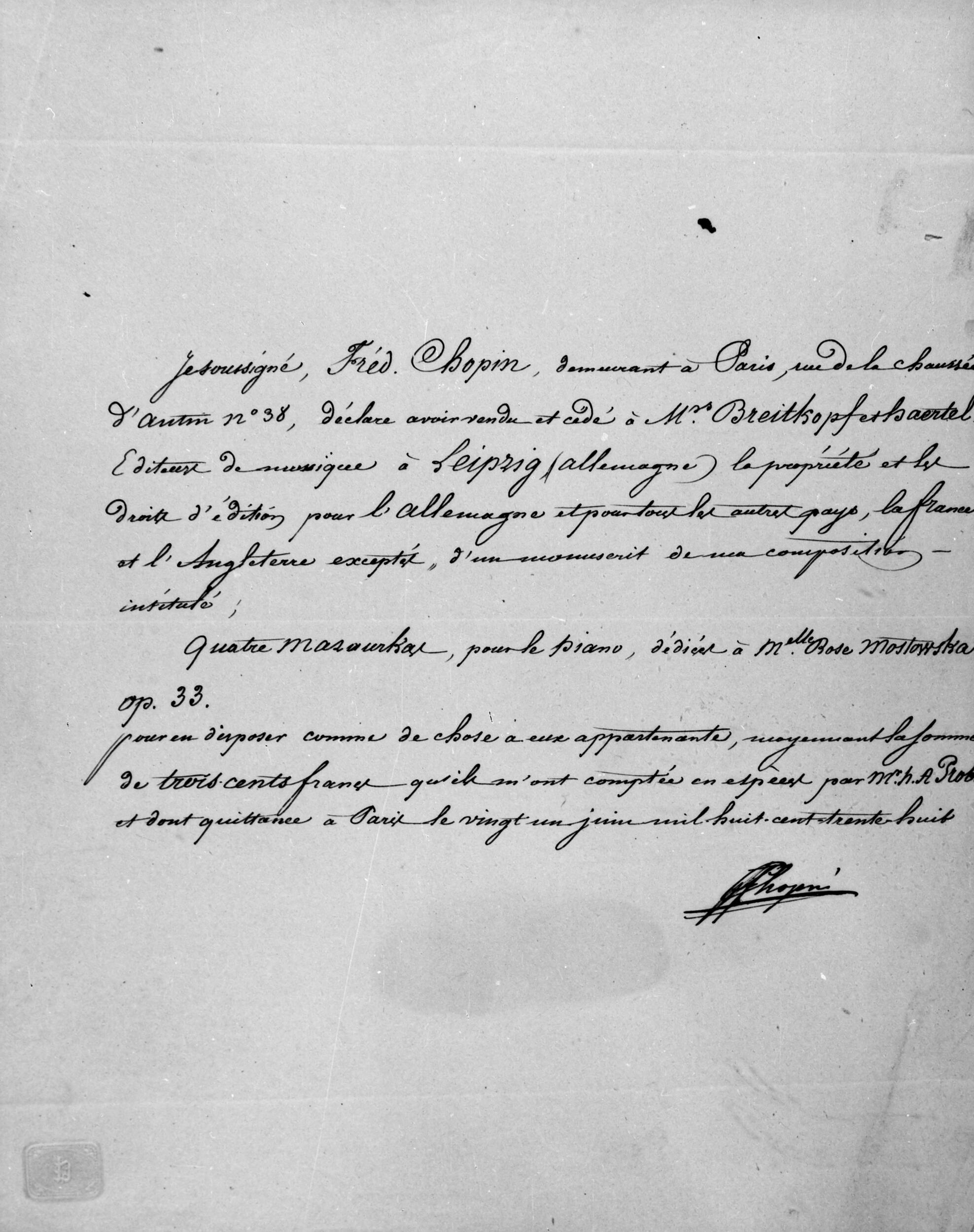 Zaświadczenie podpisane przez Fryderyka Chopina, potwierdzające sprzedaż firmie Breitkopf & Härtel praw majątkowych do czterech Mazurków op. 33 z możliwością ich publikacji na terenie wszystkich krajów poza Francją i Anglią (NEGATYWY)
