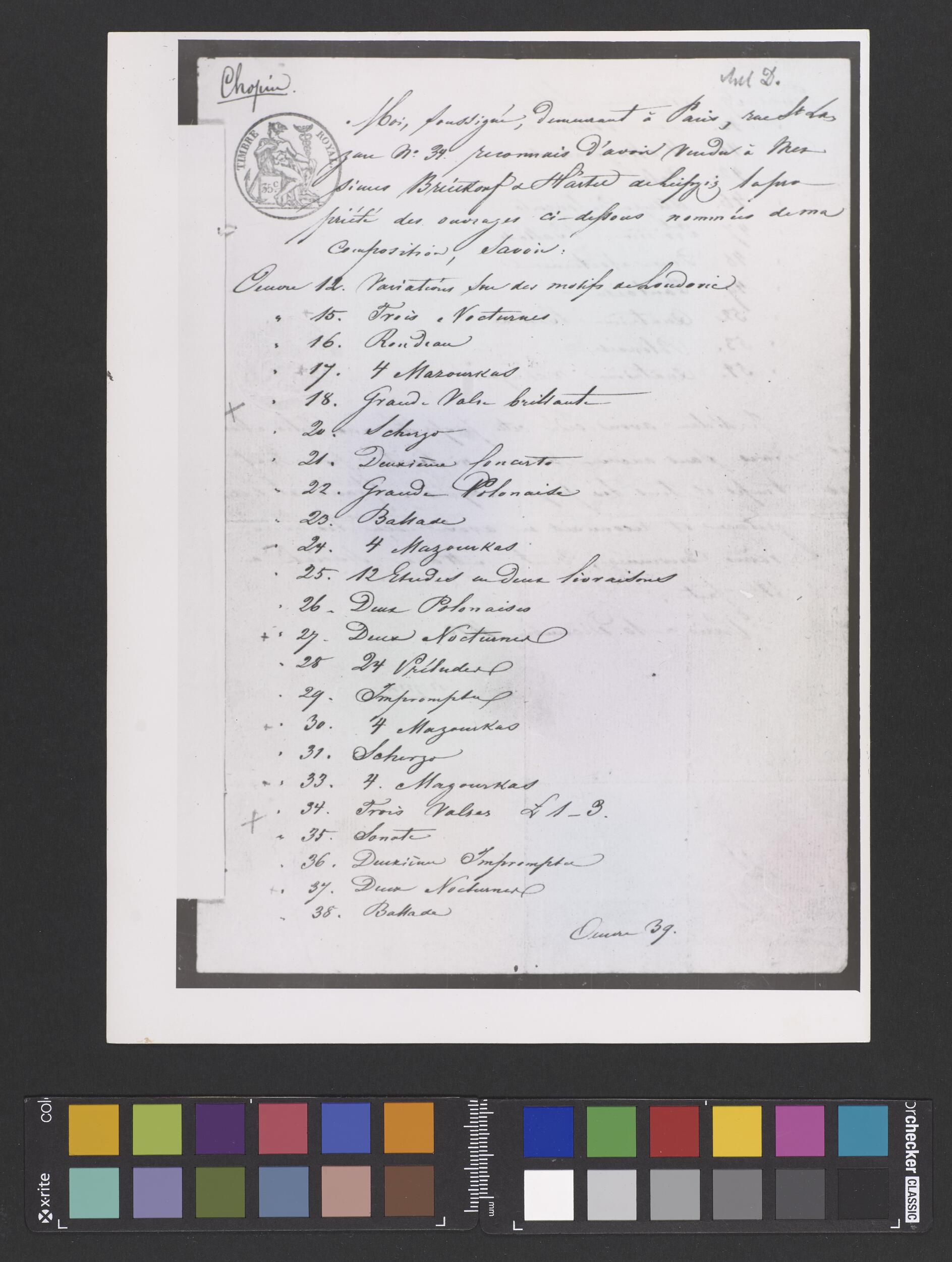 Zaświadczenie podpisane przez Fryderyka Chopina, potwierdzające sprzedaż firmie Breitkopf & Härtel praw majątkowych do utworów opus: 12, 15–18, 20–31, 33–42, 46–49, 52–54 z możliwością ich publikacji na terenie wszystkich krajów poza Francją i Anglią (POZYTYWY III EGZ)