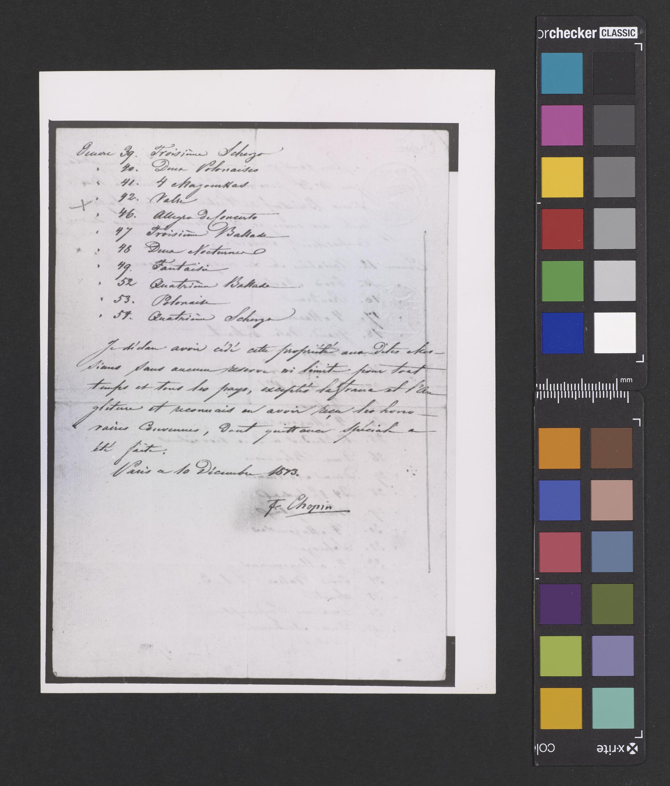 Zaświadczenie podpisane przez Fryderyka Chopina, potwierdzające sprzedaż firmie Breitkopf & Härtel praw majątkowych do utworów opus: 12, 15–18, 20–31, 33–42, 46–49, 52–54 z możliwością ich publikacji na terenie wszystkich krajów poza Francją i Anglią (POZYTYWY II EGZ)