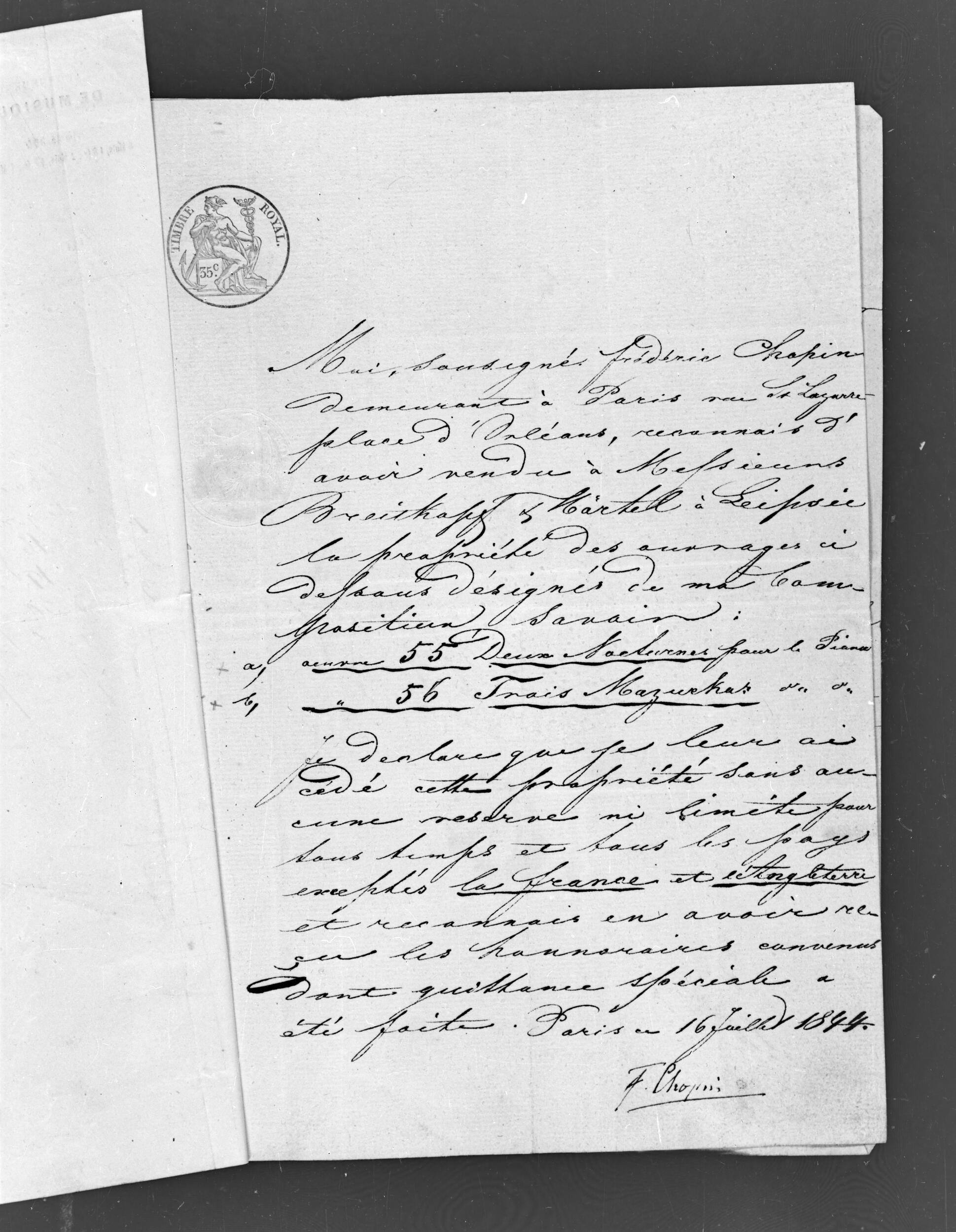 Zaświadczenie podpisane przez Fryderyka Chopina, potwierdzające sprzedaż firmie Breitkopf & Härtel praw majątkowych do dwóch Nokturnów op. 55 oraz trzech Mazurków op. 56 z możliwością ich publikacji na terenie wszystkich krajów poza Francją i Anglią (NEGATYW)