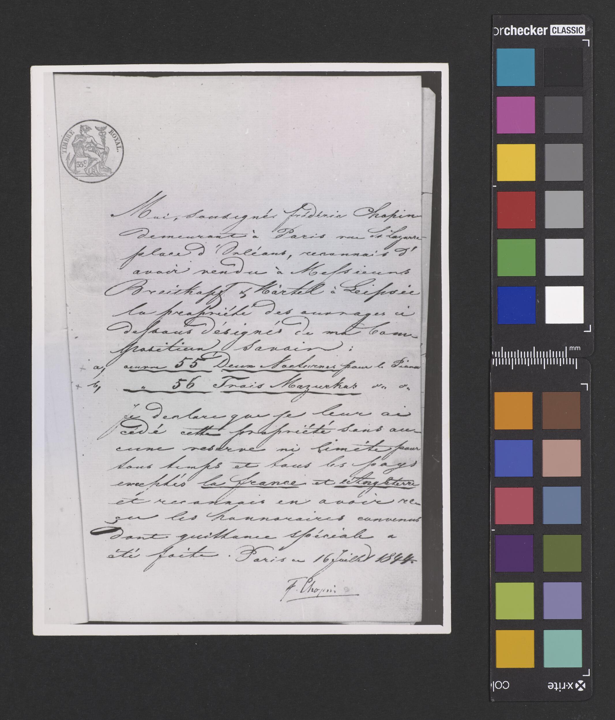 Zaświadczenie podpisane przez Fryderyka Chopina, potwierdzające sprzedaż firmie Breitkopf & Härtel praw majątkowych do dwóch Nokturnów op. 55 oraz trzech Mazurków op. 56 z możliwością ich publikacji na terenie wszystkich krajów poza Francją i Anglią (POZYTYW I EGZ)