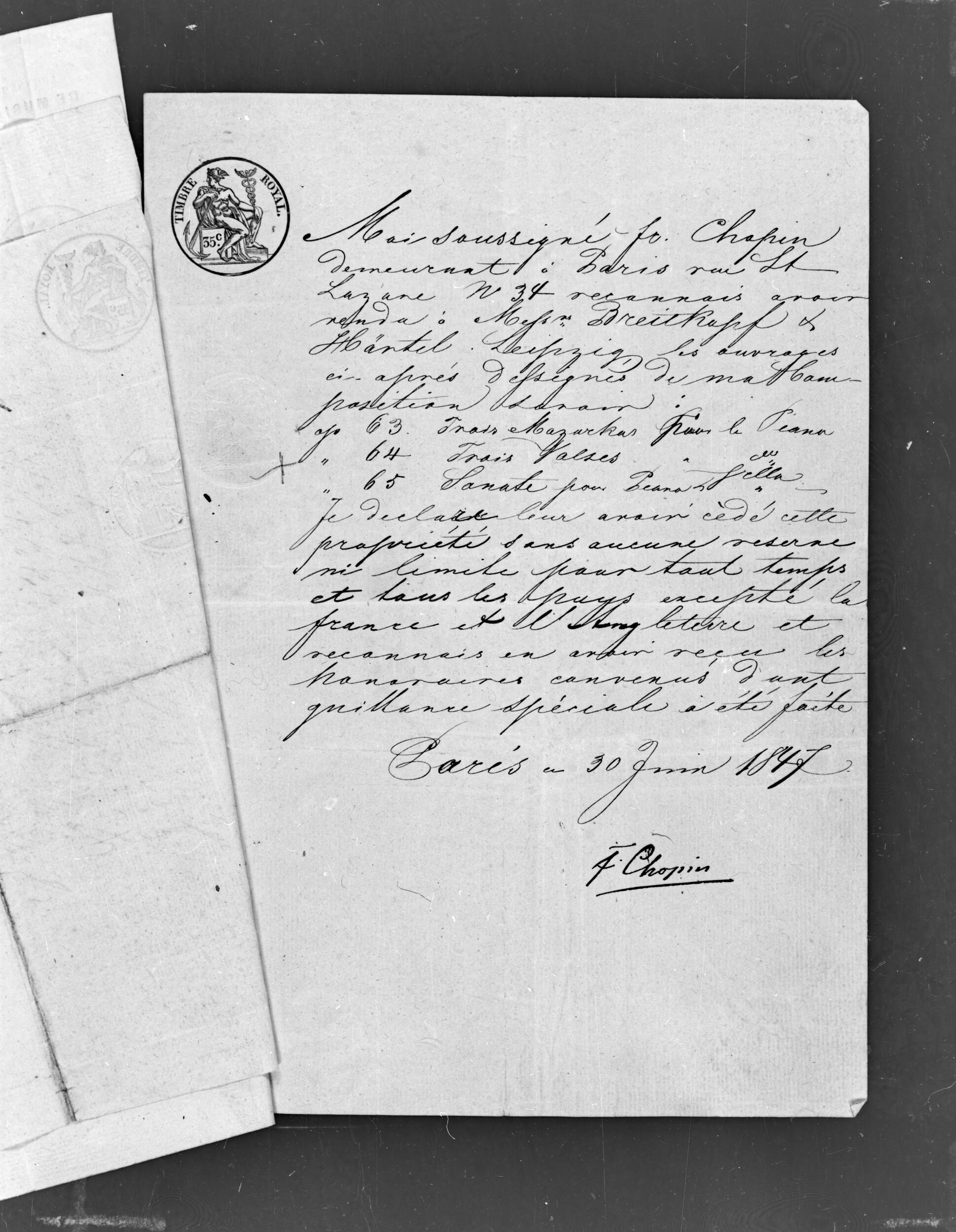 Zaświadczenie podpisane przez Fryderyka Chopina, potwierdzające sprzedaż firmie Breitkopf & Härtel praw majątkowych do trzech Mazurków op. 63, trzech Walców op. 64 oraz Sonaty g-moll op. 65 z możliwością ich publikacji na terenie wszystkich krajów poza Francją i Anglią (NEGATYW)
