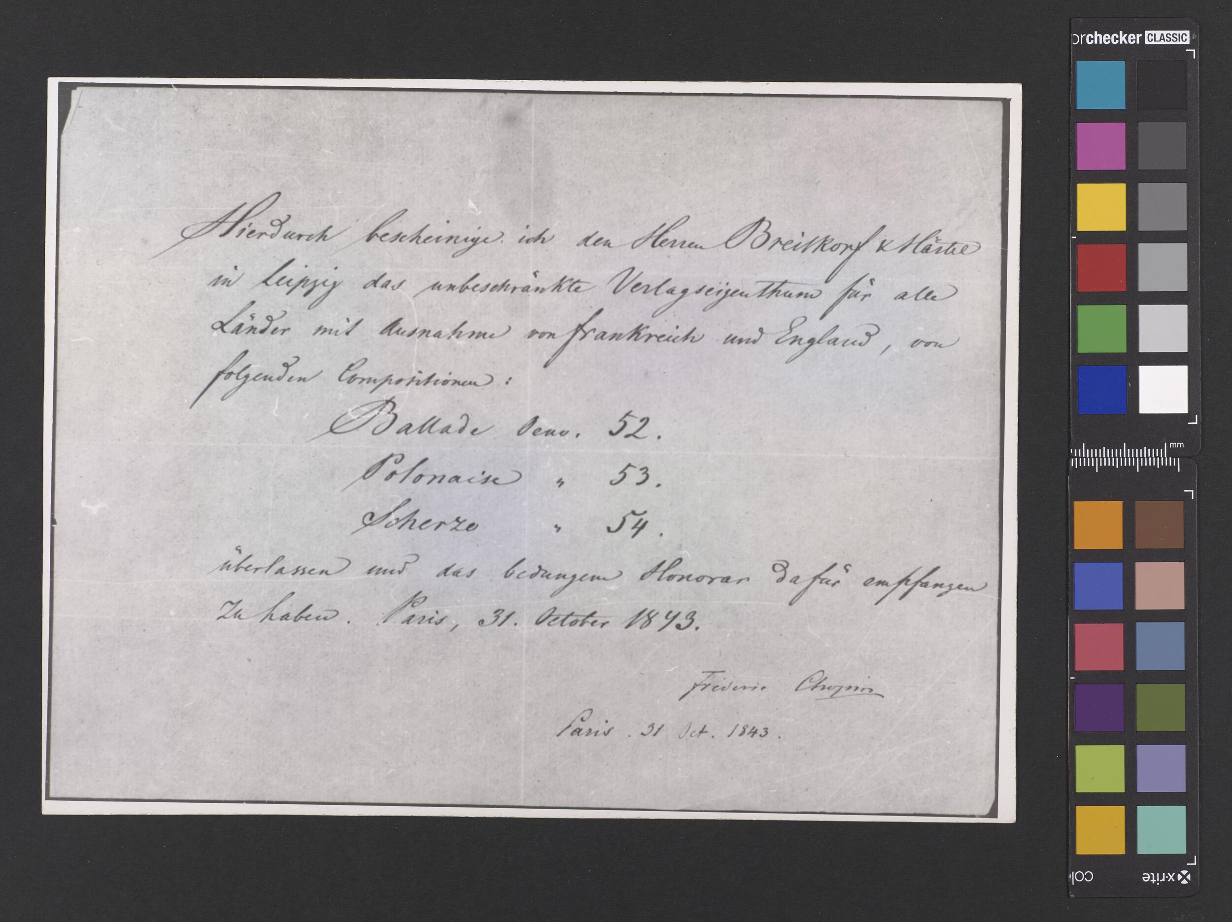 Zaświadczenie podpisane przez Fryderyka Chopina, potwierdzające sprzedaż firmie Breitkopf & Härtel praw majątkowych do Ballady f-moll op. 52, Poloneza As-dur op. 53 oraz Scherza E-dur op. 54 z możliwością ich publikacji na terenie wszystkich krajów poza Francją i Anglią (POZYTYW III EGZ)