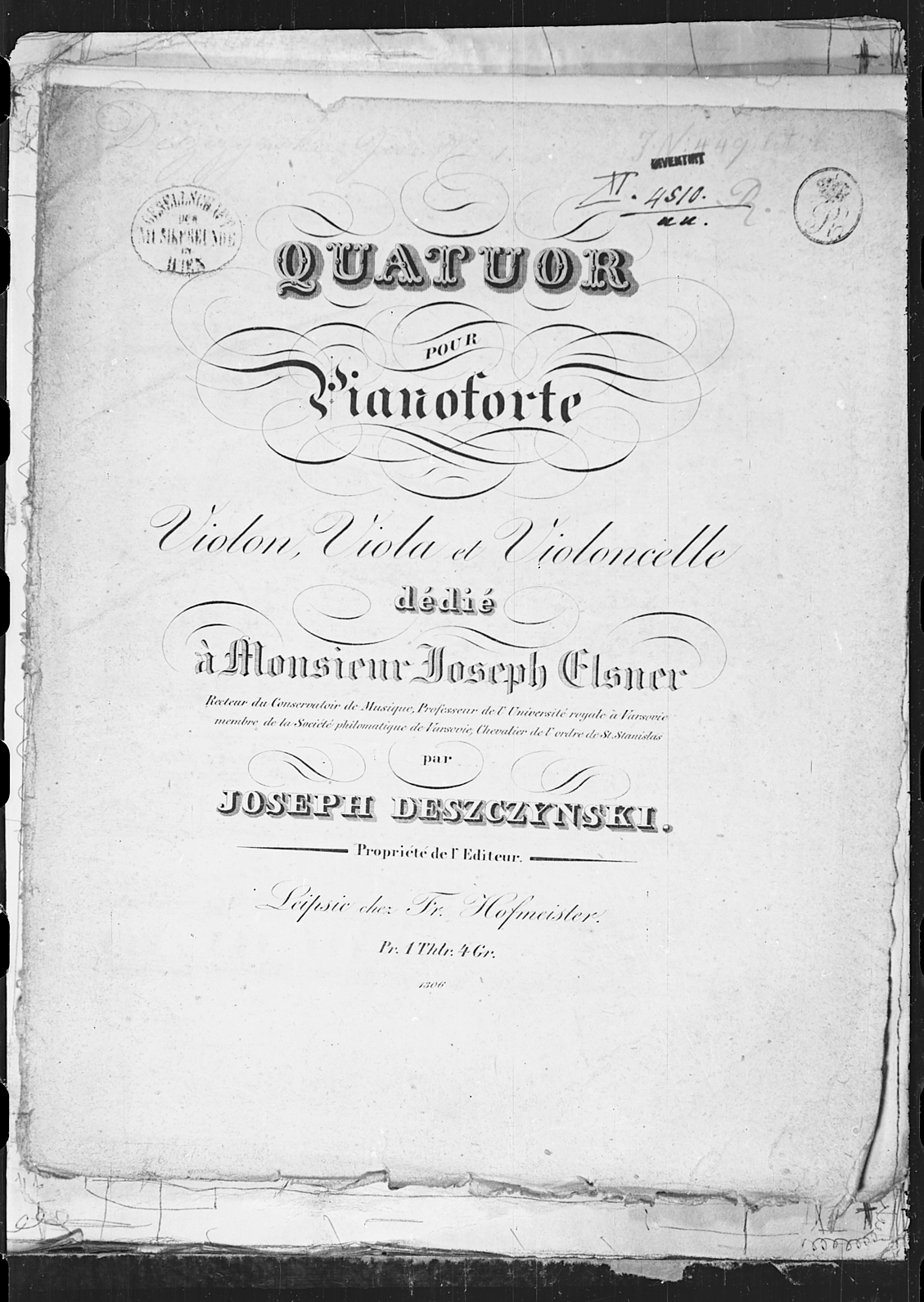 „QUATUOR | POUR | Pianoforte | Violon, Viola et Violoncelle | dédié | à Monsieur Joseph Elsner | Recteur du Conservatoir de Musique, Professeur de l'Université royale à Varsovie | membre de la Société philomatique de Varsovie, Chevalier de l'ordre de St. Stanislas | par | JOSEPH DESZCZYNSKI. […]” (MIKROFILM)