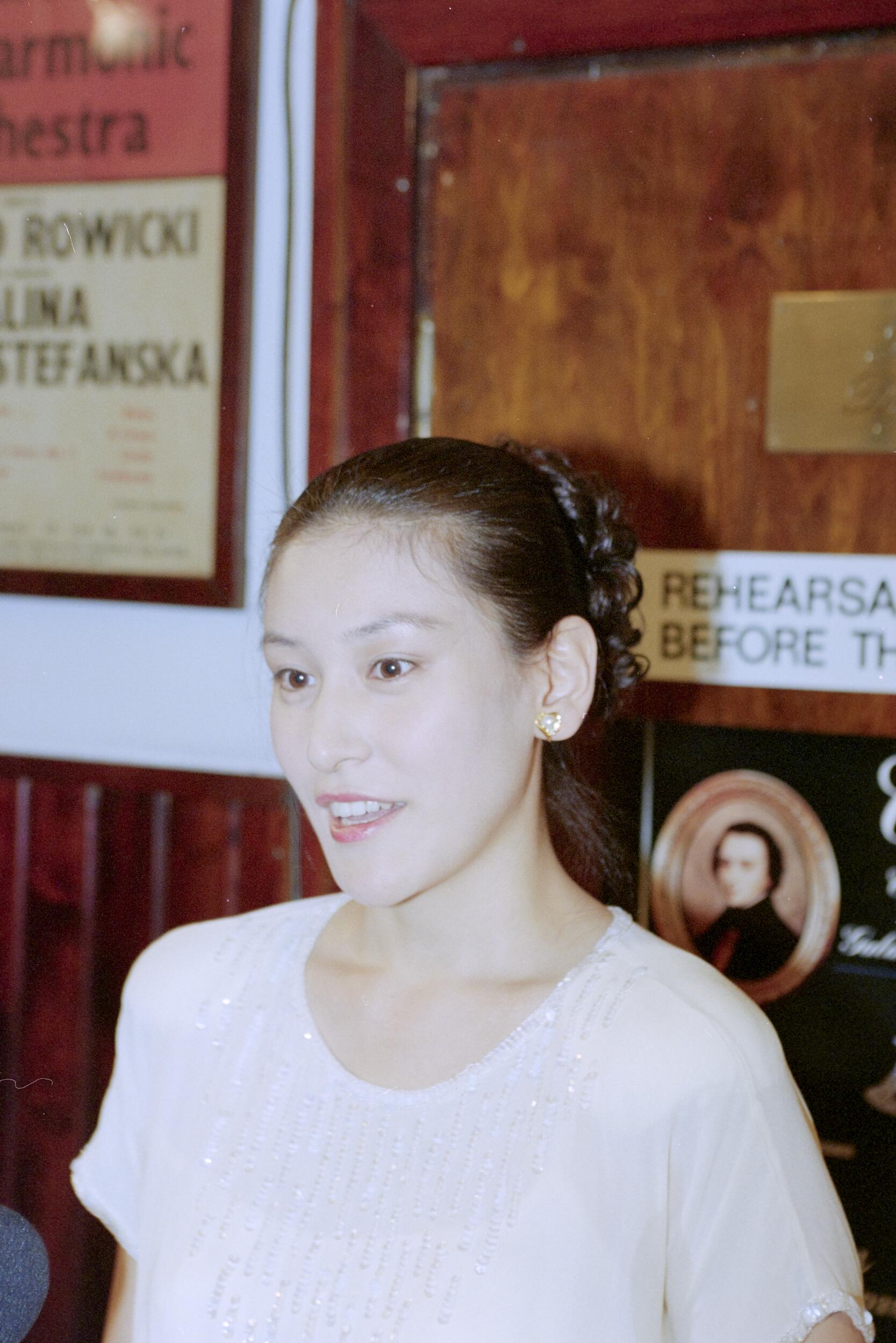 Yoko Takemura (Japonia) po występie i Alexei Sultanov (Rosja) przed występem w foyer Filharmonii Narodowej podczas XIII Międzynarodowego Konkursu Pianistycznego im. Fryderyka Chopina