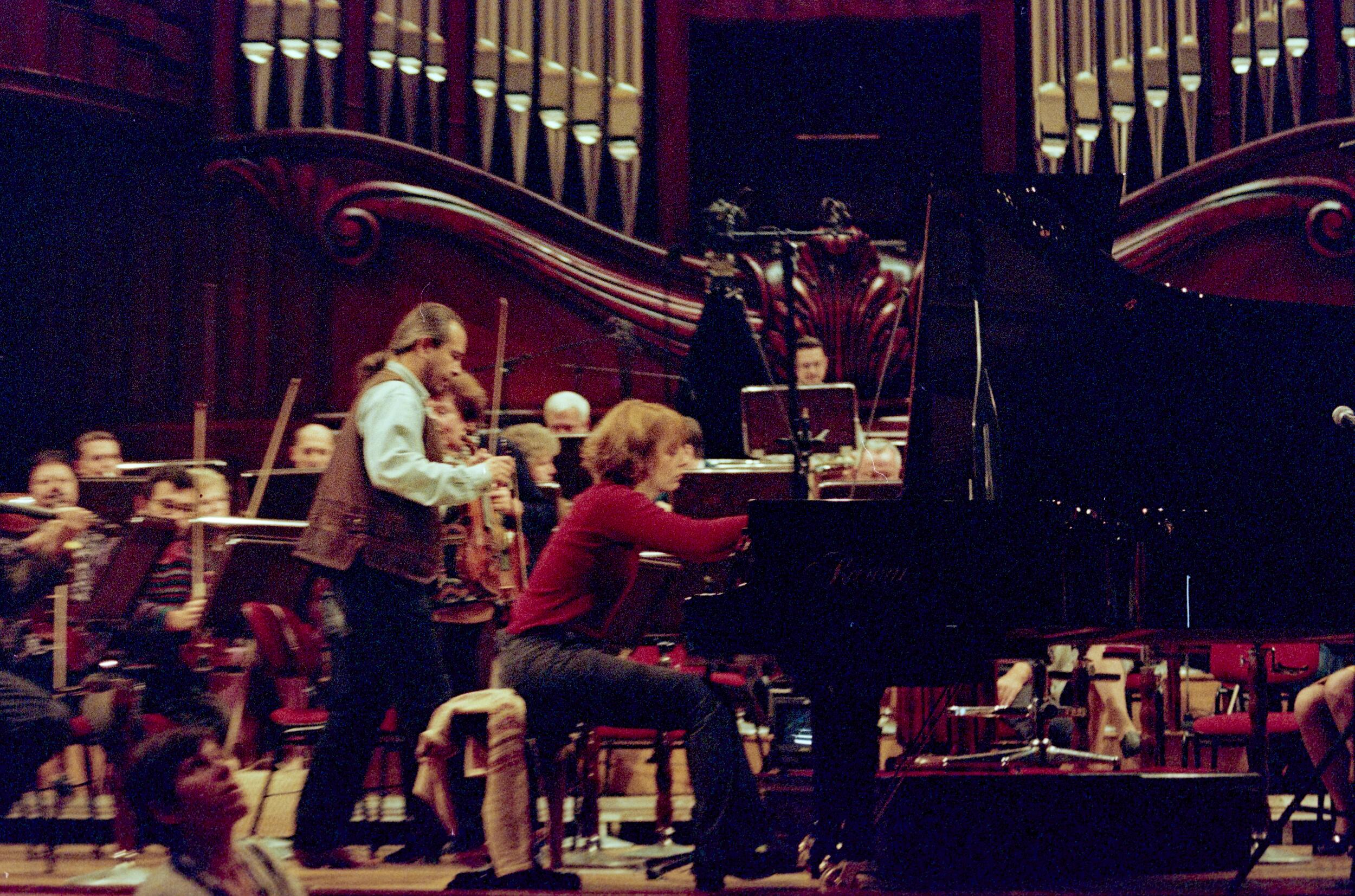 Yundi Li (Chiny), Ingrid Fliter (Argentyna) i Aleksandr Kobrin (Rosja) podczas próby z orkiestrą przed finałem XIV Międzynarodowego Konkursu Pianistycznego im. Fryderyka Chopina