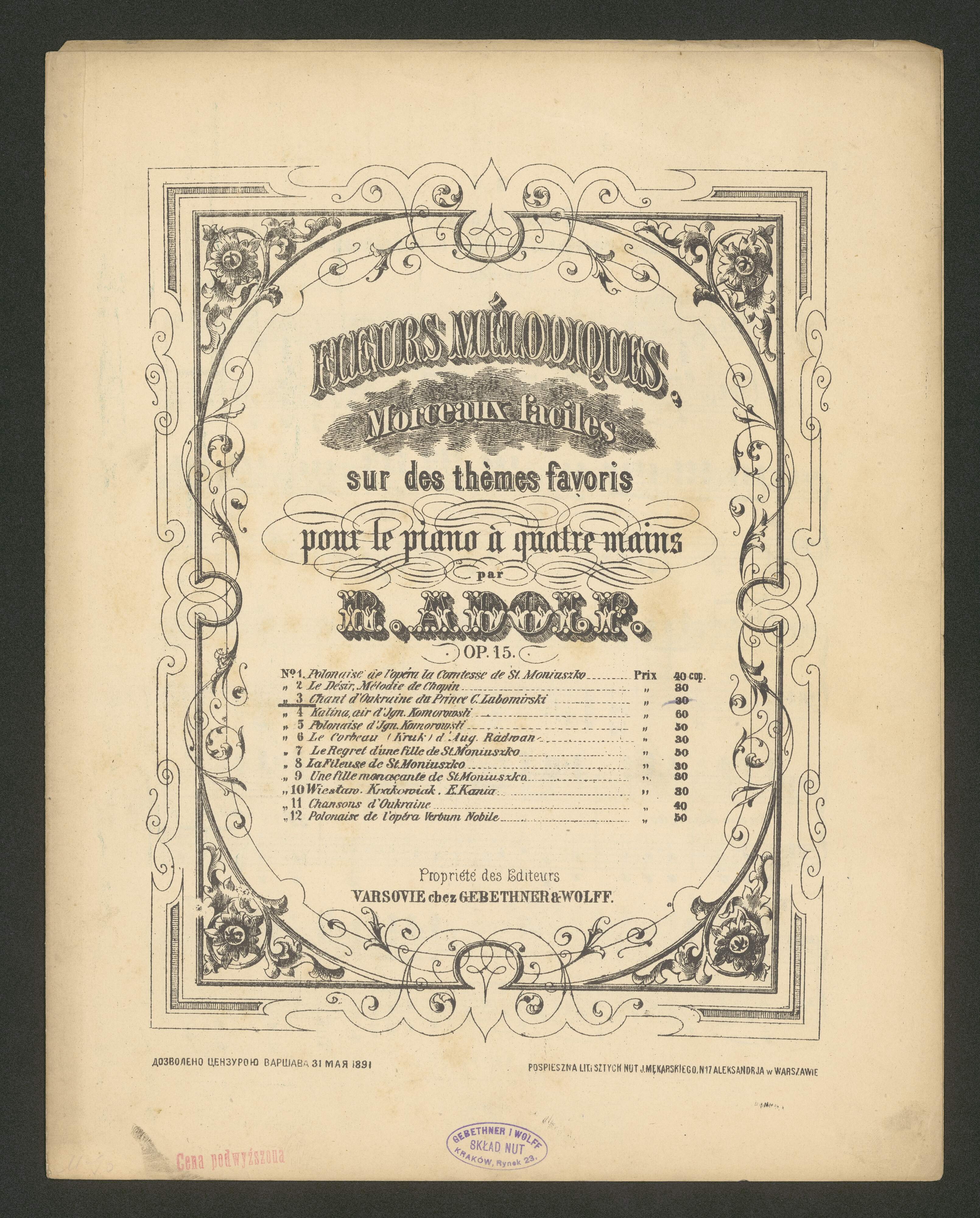[title page:] FLEURS MÉLODIQUES. | Morceaux faciles | sur des thèmes favoris | pour le piano à quatre mains | par | R. ADOLF. | OP. 15. | [a list of works published within the series, among them: ",, N|o 3 Chant d’Oukraine du Prince C. Lubomirski"] | 30 cop. | Propriéte des Editeurs | VARSOVIE chez GEBETHNER & WOLFF. | [on the left side:] Дозволено Цензурою Варшава 5 Января 1898 [on the right side:] Lit. Mękarski 40 Krak. Przed. Warszawa