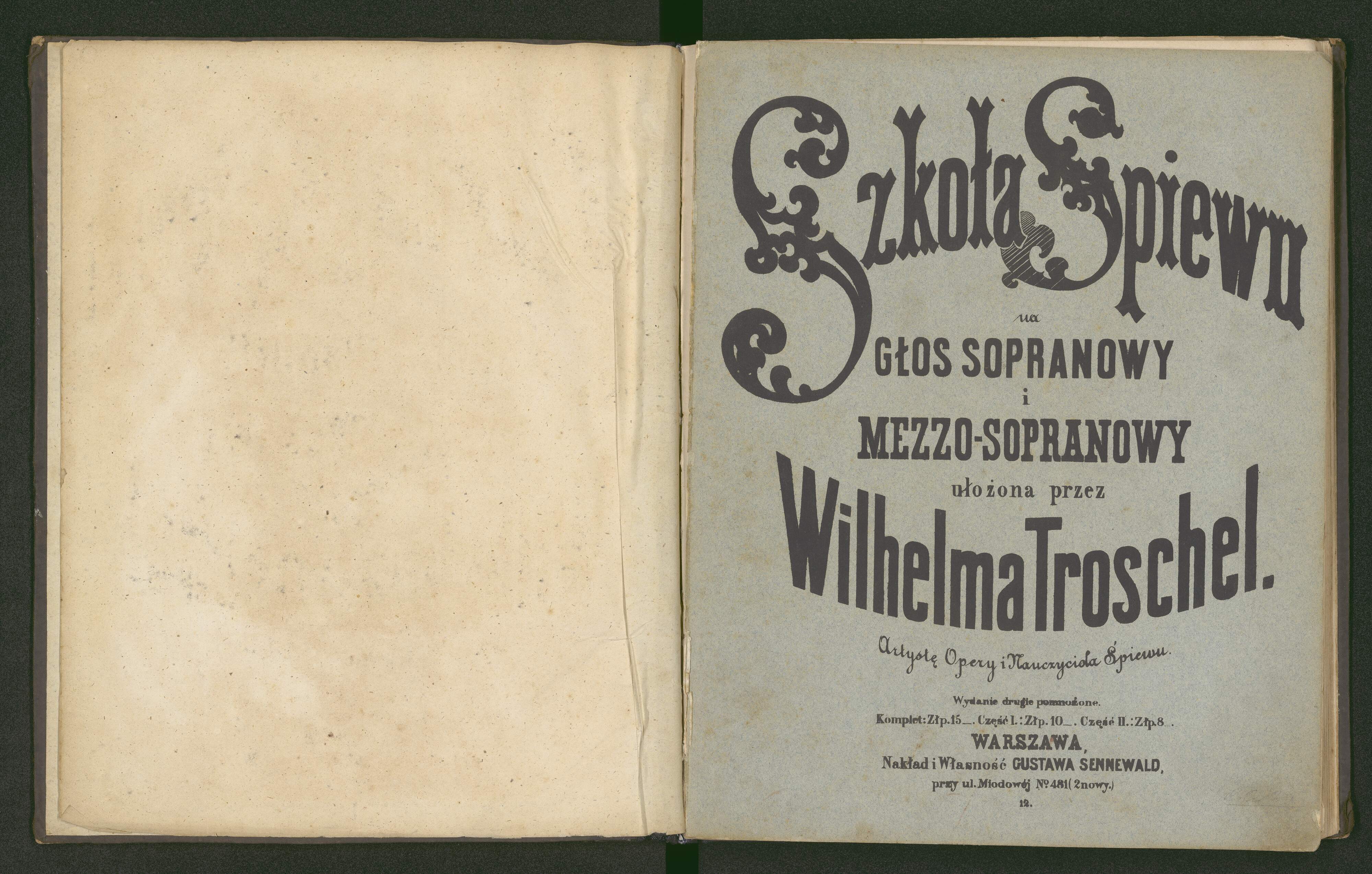 [cover title, p. 3:] Szkoła Śpiewu | na | GŁOS SOPRANOWY | i | MEZZOSOPRANOWY | ułożona przez | Wilhelma Troschel. | Artystę Opery i Nauczyciela Śpiewu. | Wydanie drugie pomnożone. | Komplet: Złp. 15__. Część I: Złp. 10__. Część II: Złp. 8__. | WARSZAWA | Nakład i Własność GUSTAWA SENNEWALD, | przy ul. Miodowej №481(2 nowy.) | 12