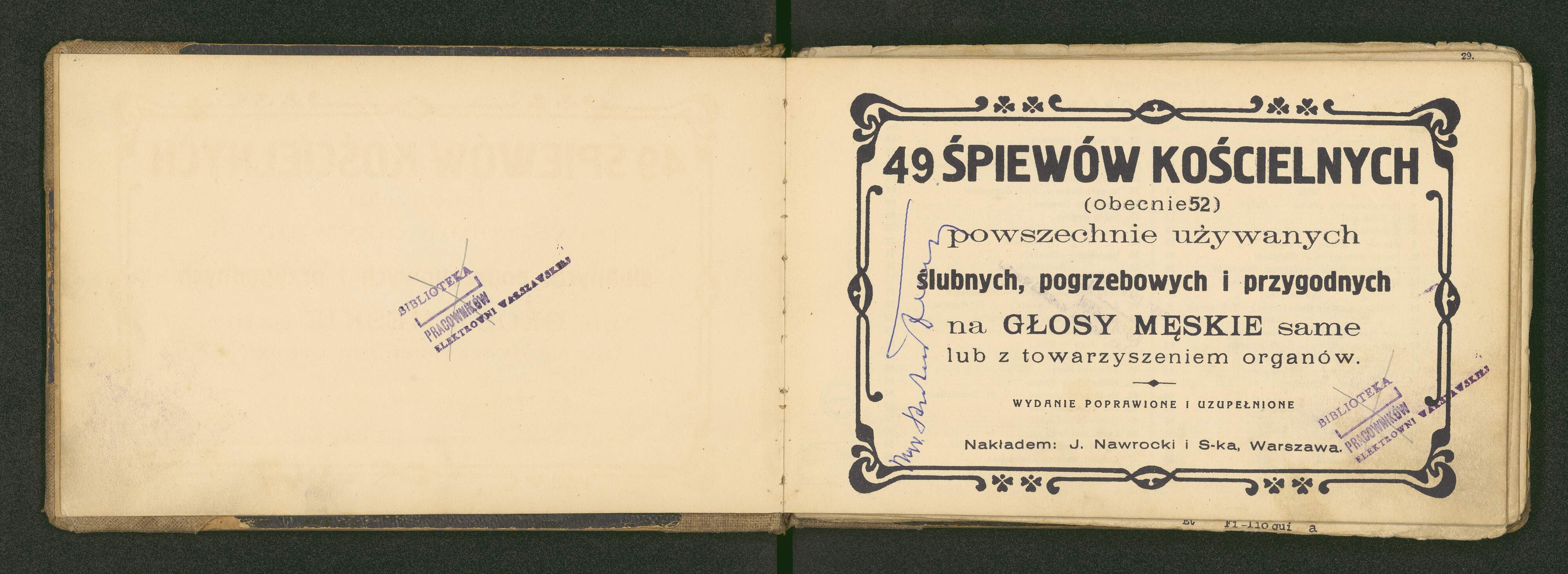49 ŚPIEWÓW KOŚCIELNYCH | (obecnie 52) | powszechnie używanych | ślubnych, pogrzebowych i przygodnych | na GŁOSY MĘSKIE same | lub z towarzyszeniem organów. | WYDANIE POPRAWIONE I UZUPEŁNIONE | Nakładem: J. Nawrocki i S-ka, Warszawa