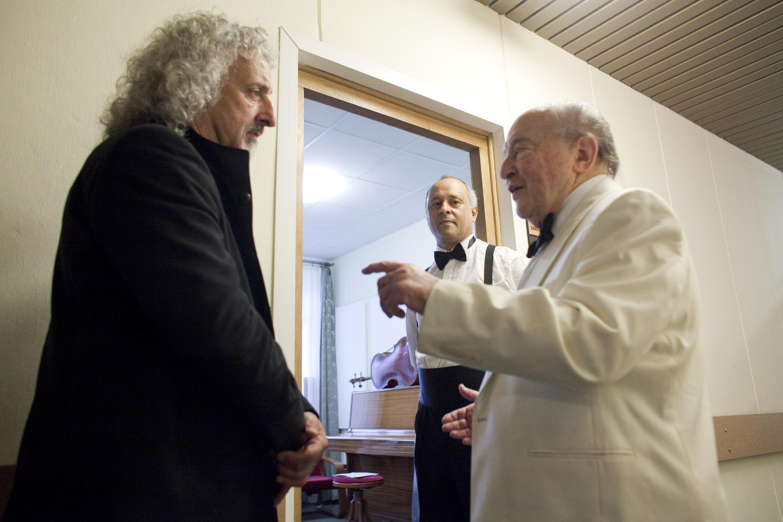 Artyści Antonio Meneses i Menahem Pressler przyjmują gratulacje po koncercie w Studiu Koncertowym Polskiego Radia im. Witolda Lutosławskiego w Warszawie podczas VI Międzynarodowego Festiwalu Muzycznego „Chopin i Jego Europa” [5]