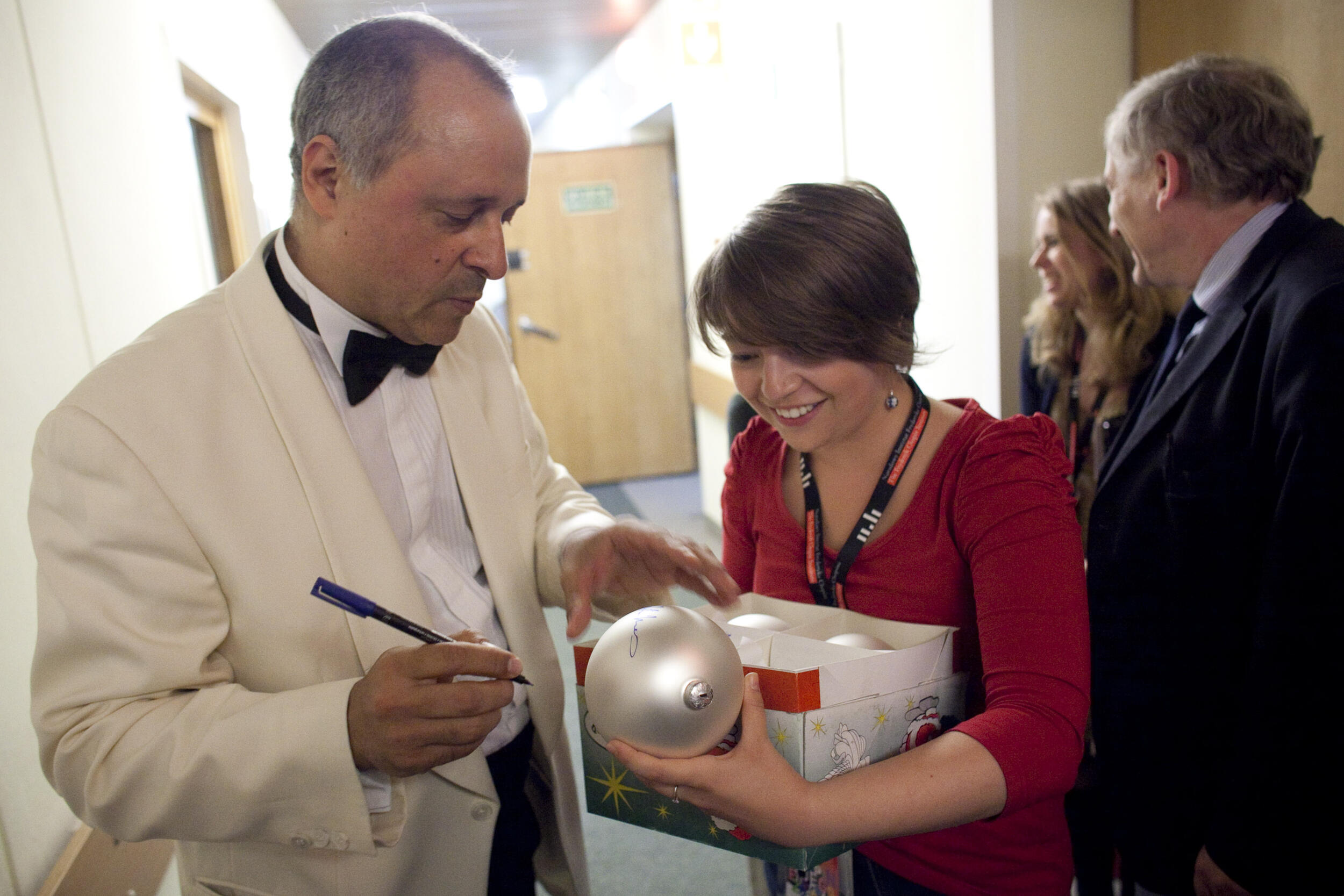 Artyści Antonio Meneses i Menahem Pressler przyjmują gratulacje po koncercie w Studiu Koncertowym Polskiego Radia im. Witolda Lutosławskiego w Warszawie podczas VI Międzynarodowego Festiwalu Muzycznego „Chopin i Jego Europa” [12]