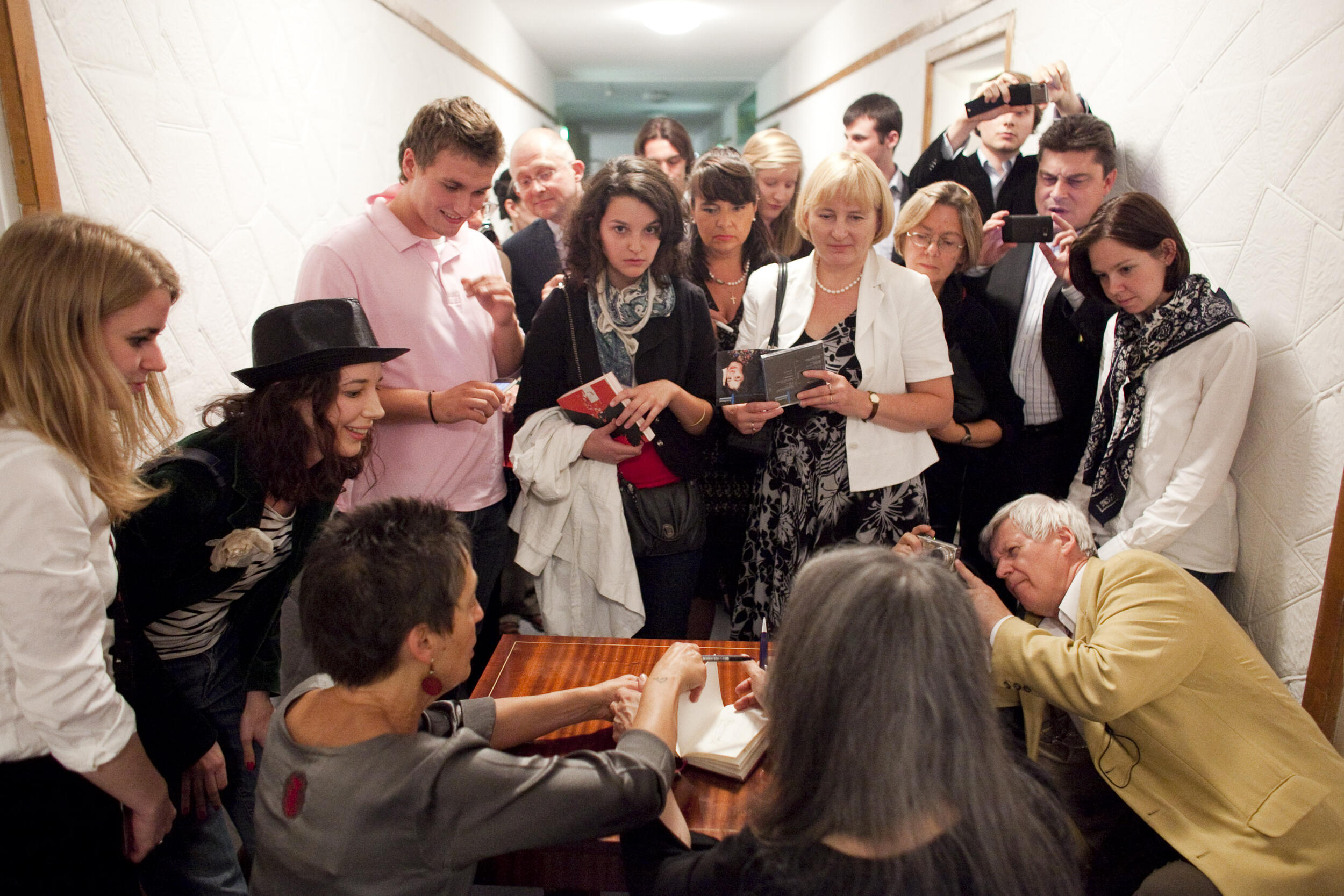 Artystki Martha Argerich i Maria João Pires po koncercie podpisują autografy w kuluarach Teatru Wielkiego – Opery Narodowej w Warszawie podczas VI Międzynarodowego Festiwalu Muzycznego „Chopin i Jego Europa” [6]