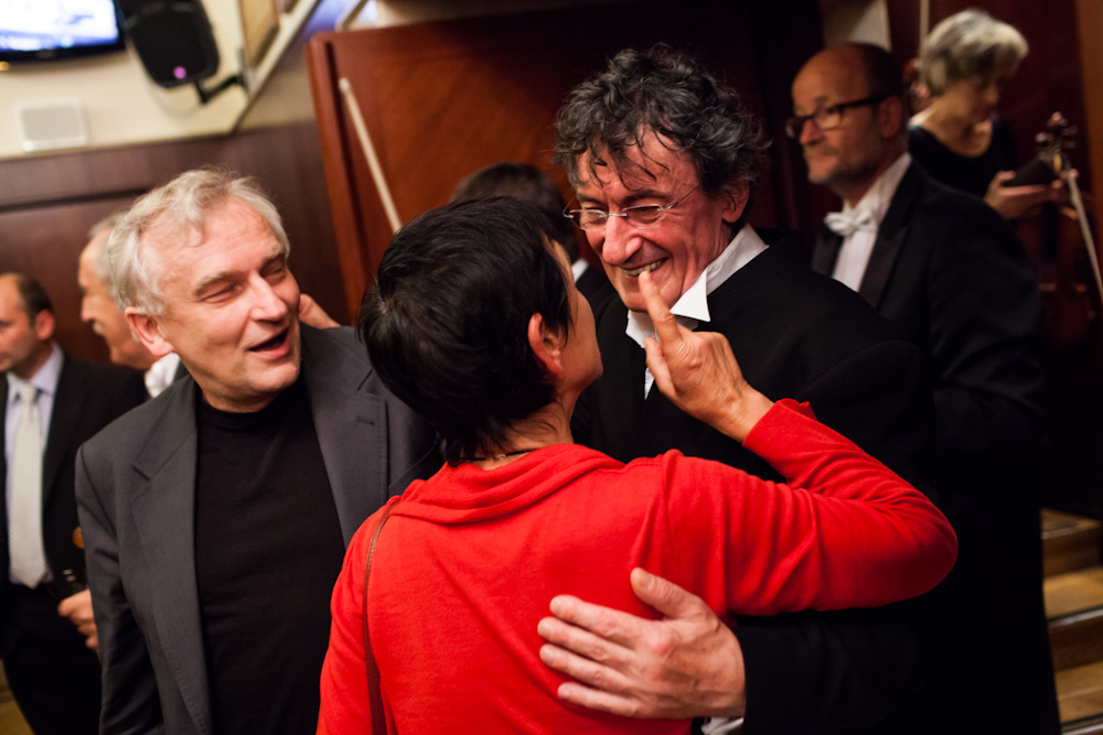 Martha Argerich, Jacek Kaspszyk oraz goście w trakcie przerwy po I części koncertu symfonicznego w Filharmonii Narodowej z udziałem Narodowej Orkiestry Symfonicznej Polskiego Radia w Katowicach podczas IX Międzynarodowego Festiwalu Muzycznego „Chopin i Jego Europa” [2]