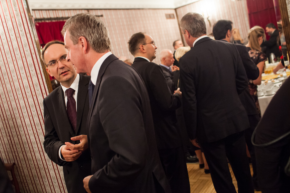 Martha Argerich, Jacek Kaspszyk oraz goście w trakcie przerwy po I części koncertu symfonicznego w Filharmonii Narodowej z udziałem Narodowej Orkiestry Symfonicznej Polskiego Radia w Katowicach podczas IX Międzynarodowego Festiwalu Muzycznego „Chopin i Jego Europa” [3]