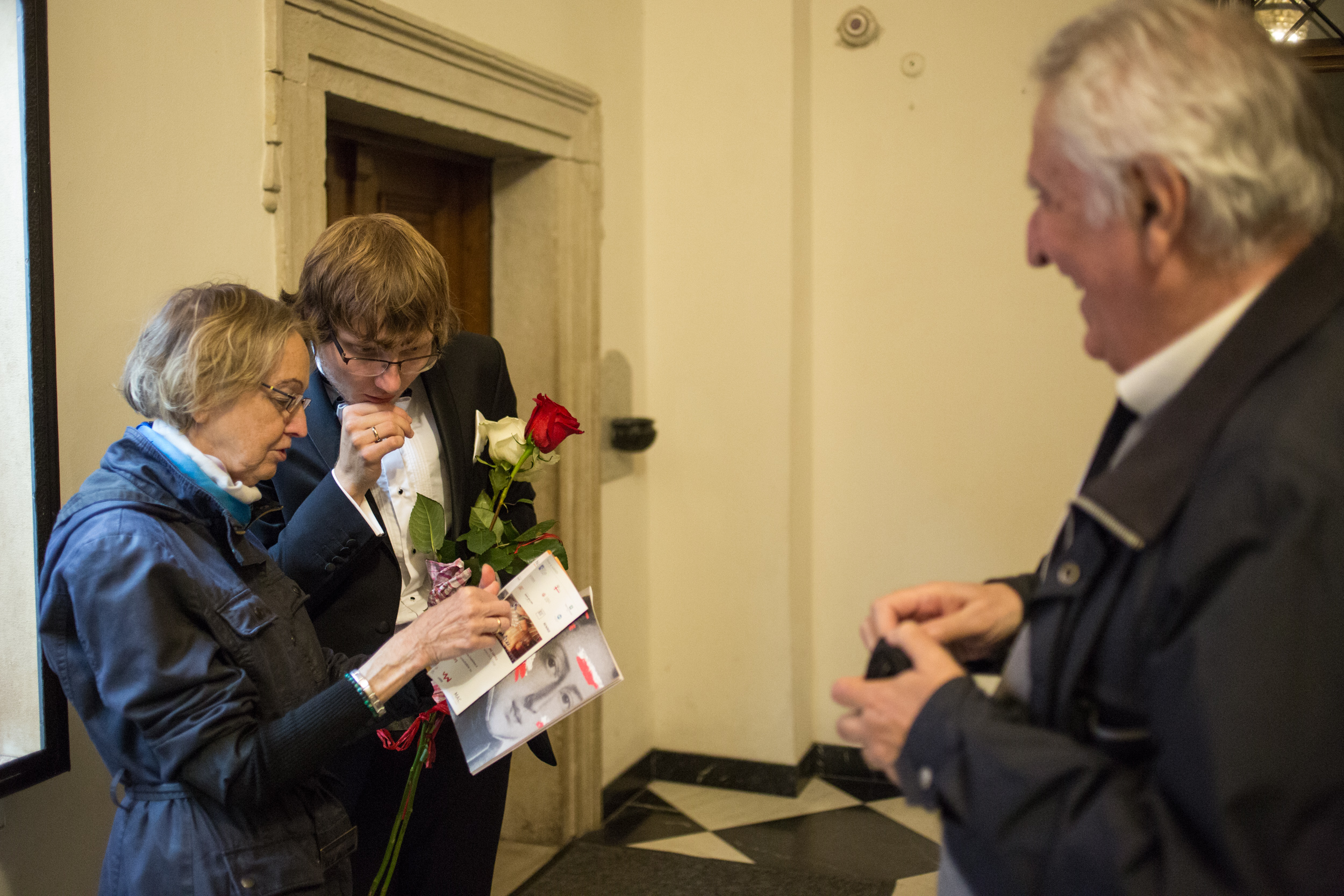 Krzysztof Książek rozdaje autografy po recitalu chopinowskim na instrumencie historycznym w Bazylice Świętego Krzyża podczas XII Międzynarodowego Festiwalu Muzycznego „Chopin i Jego Europa” [1]