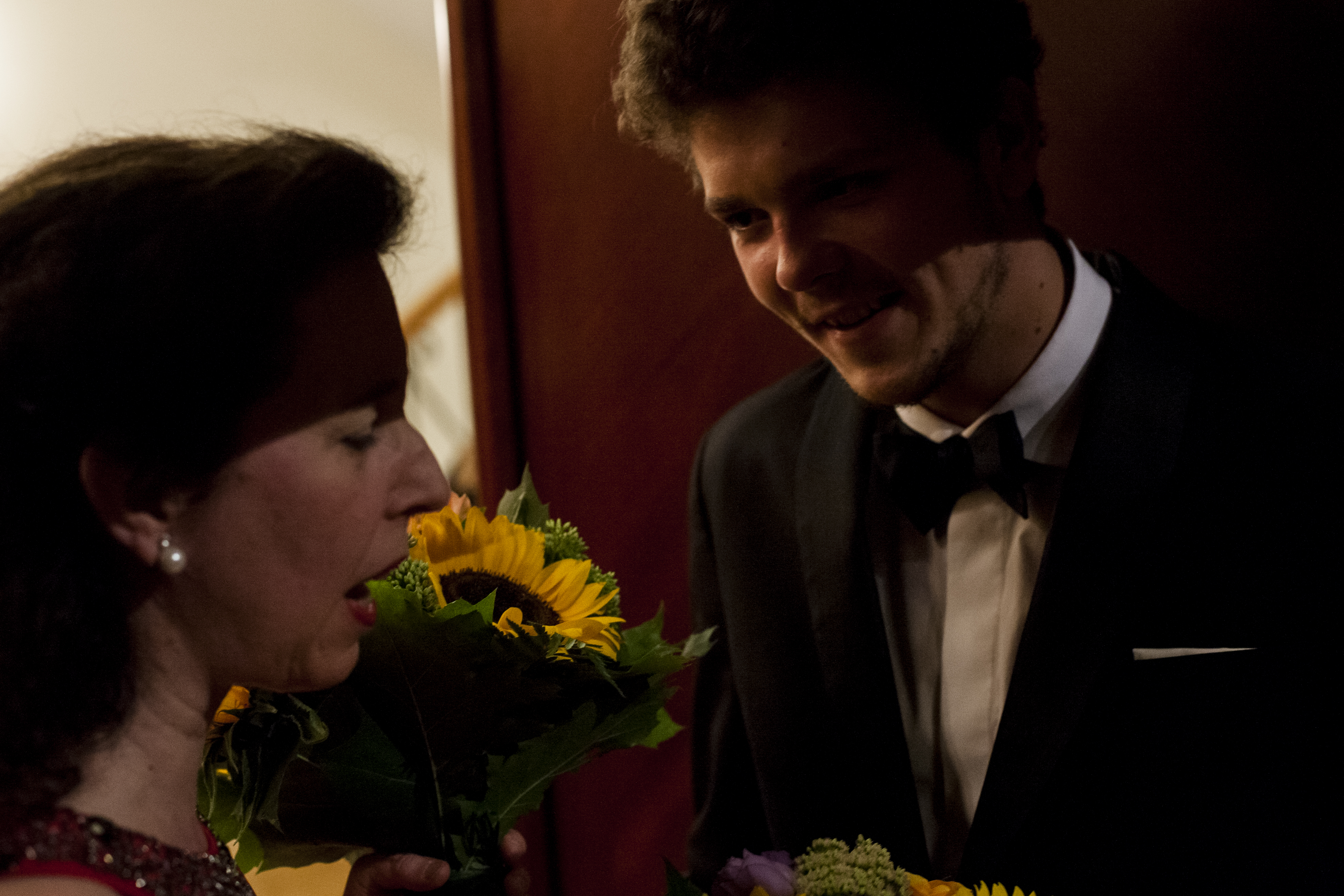 Wykonawcy otrzymują gratulacje po koncercie w Filharmonii Narodowej podczas XIII Międzynarodowego Festiwalu Muzycznego „Chopin i Jego Europa” [1]