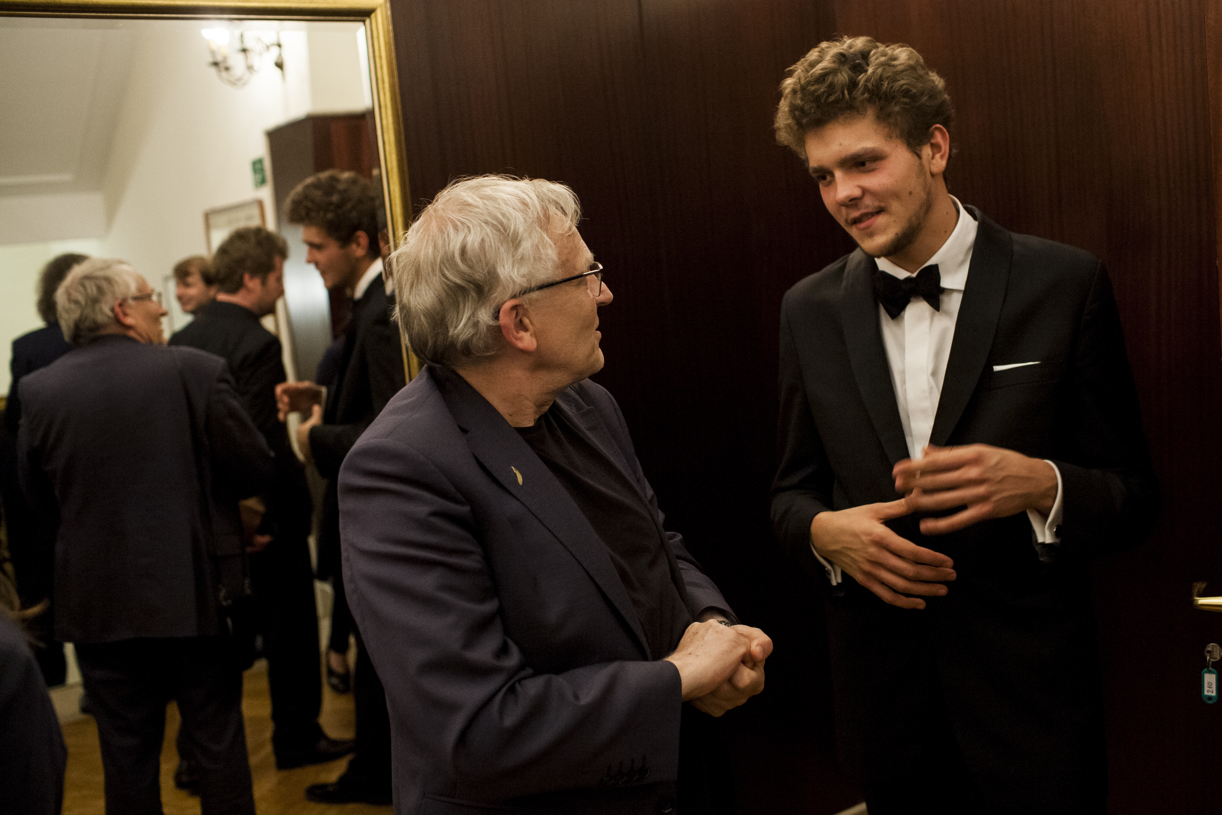 Wykonawcy otrzymują gratulacje po koncercie w Filharmonii Narodowej podczas XIII Międzynarodowego Festiwalu Muzycznego „Chopin i Jego Europa” [6]