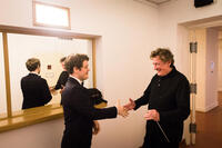 Wojciech Grzędziński, Chopin i Jego Europa 2018, Przerwa po I części koncertu symfonicznego: Yaara Tal otrzymuje gratulacje od dyrektora Stanisława Leszczyńskiego w Teatrze Wielkim – Operze Narodowej, Warszawa, 31/08/2018.