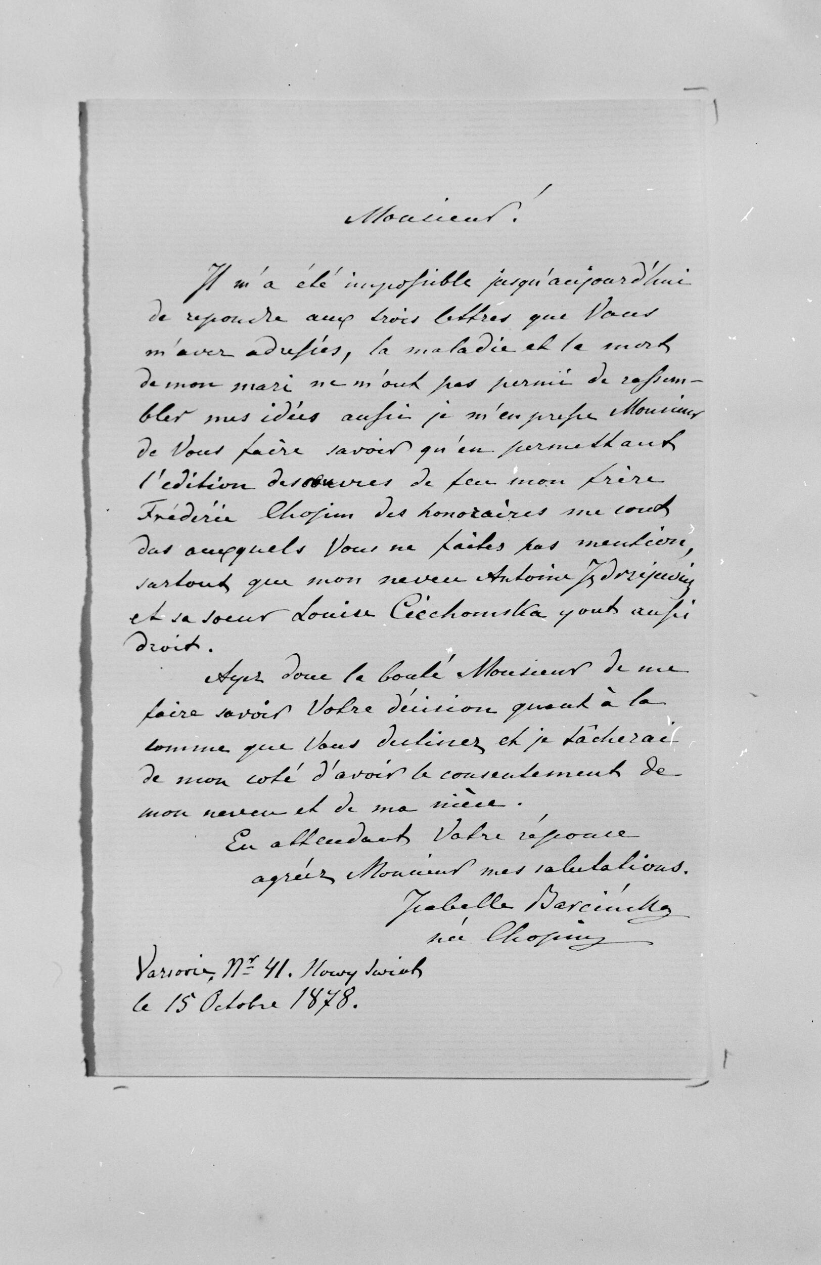 Kopia listu Izabelli Barcińskiej do firmy Breitkopf & Härtel w Lipsku (NEGATYW)
