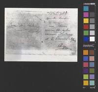 Autor nieznany, reprodukcja (1965) listu Fryderyka Chopina do firmy wydawniczej Maurice'a Schlesingera w Paryżu, „Ayez la bonté | de m'envoyer | mes [...]”, sygn.: „Chopin”, [Paryż, 20/02/1838], s. 1–2., [PL:] Proszę łaskawie przesłać mi [...], s. 1: adresat: „Chez Mr Schlesinger”;, s. 2: adnotacja ręką nieustalonej osoby na górnym marginesie: „Écrit chez Madme Peruzzi | le 20 Fevrier 1838”, Towarzystwo imienia Fryderyka Chopina (Warszawa)