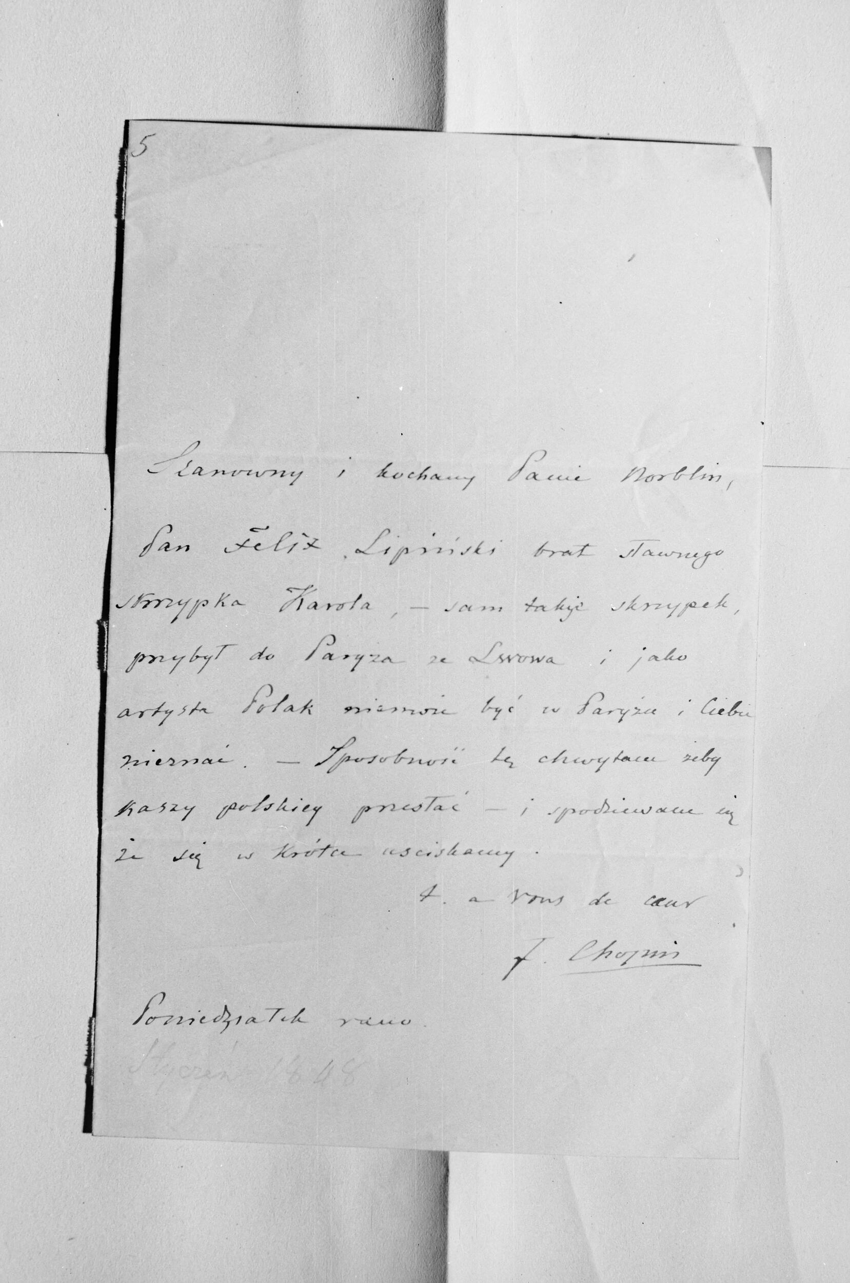 „Szanowny i kochany Panie Norblin, | Pan Feliks Lipiński, brat sławnego | skrzypka, Karola [...]” (NEGATYW)