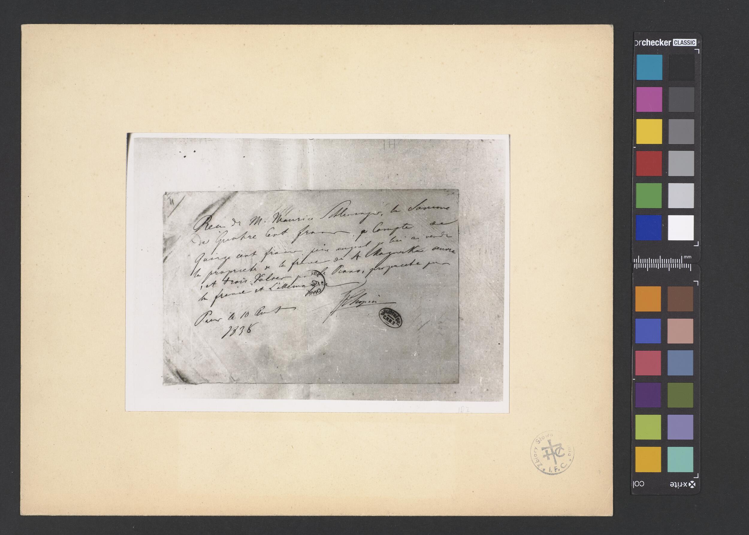 Pokwitowanie podpisane przez Fryderyka Chopina, potwierdzające sprzedaż oficynie Maurycego Schlesingera praw majątkowych do czterech Mazurków op. 33 z możliwością publikacji na terenie Francji oraz do trzech Walców op. 34 z możliwością publikacji na terenie Francji i Niemiec (POZYTYW)