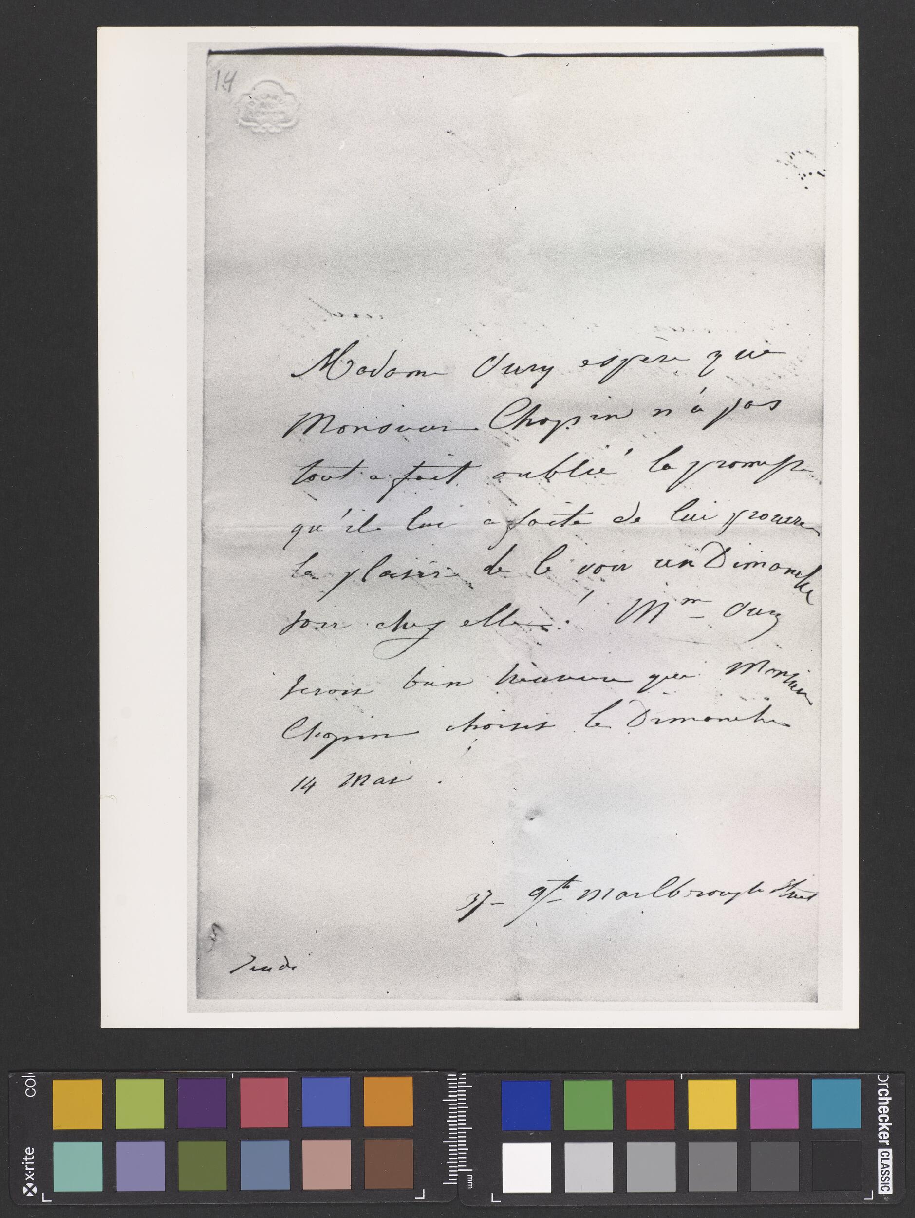 List napisany ręką nieustalonej osoby w imieniu Anne Caroline de Belleville-Oury do Fryderyka Chopina w Londynie (POZYTYW I EGZ)