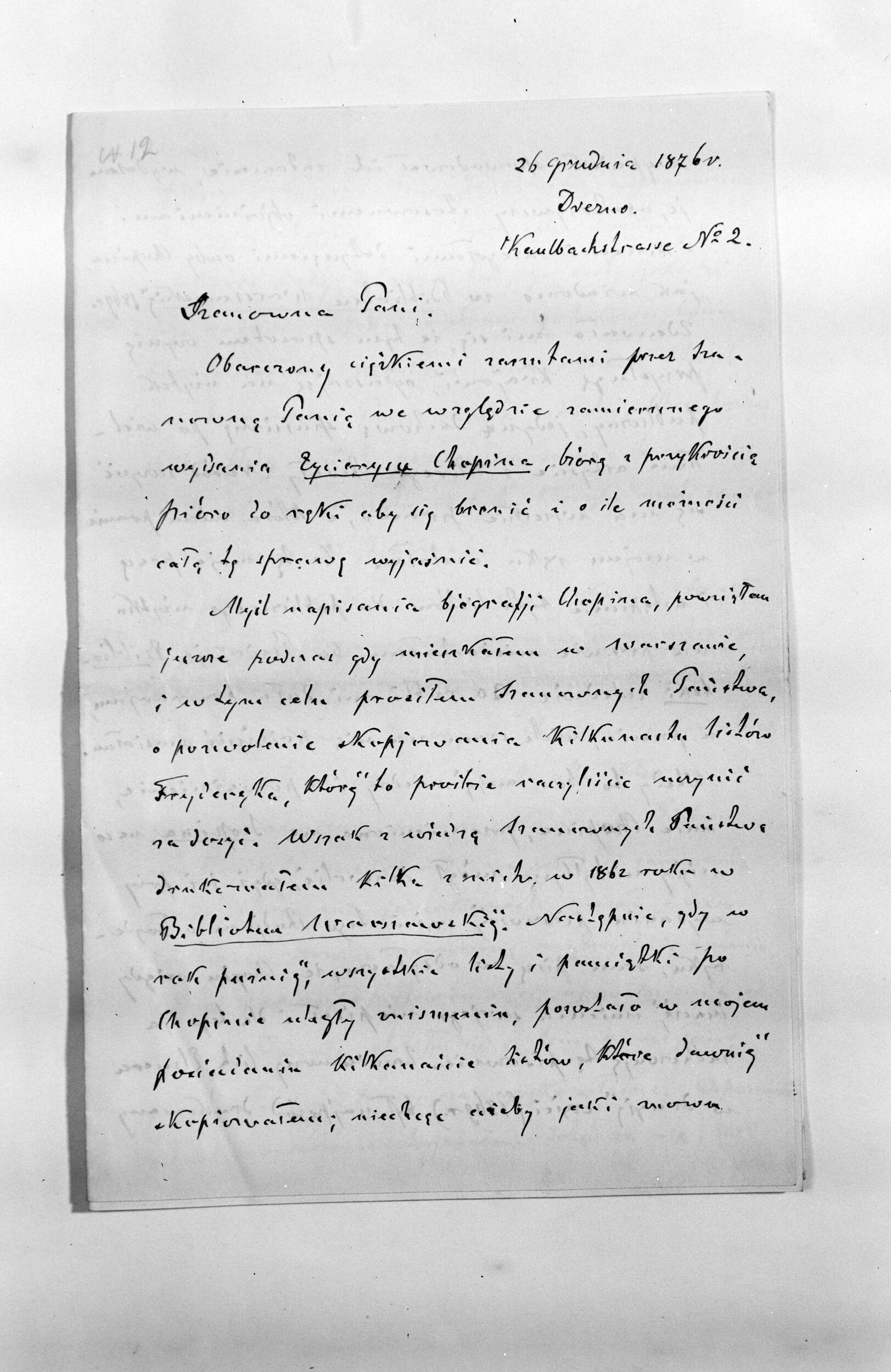 List Maurycego Karasowskiego do Izabelli Barcińskiej w Warszawie (NEGATYWY)