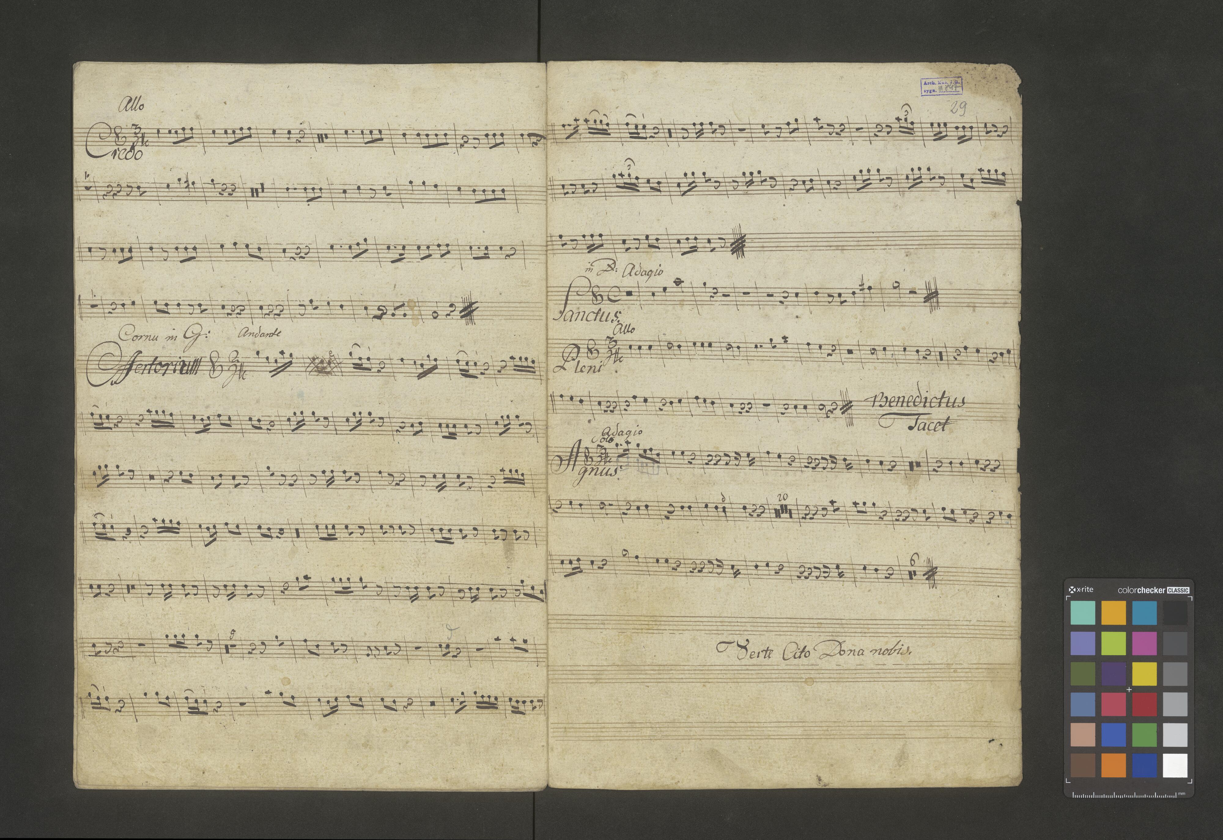 Missa in D. | a | Canto, Alto, Tenore, Basso. | Violino Imo et IIdo | Oboe Imo et IIdo | Cornu Imo et IIdo | Alto Viola | con | Organo | Authore «N.N.» | Pro Choro Claro Mo: Czenst: Re[visum]: 1839