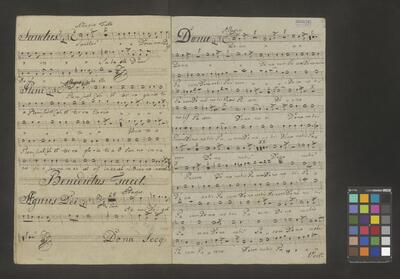 [pl-text: Wcześniejsze sygnatury: Na f. 1r partii org w lewym górnym rogu niebieską kredką "N84"; Na f. 1r partii T w prawym górnym rogu ołówkiem ręką W. Świerczka "45" w owalnym kółku"], [pl-text: Na środku po prawej stronie okładki okrągła pieczęć "* ARCHIVUM * C. M. C." ], [pl-text: Dopiski tuszem ręką F. Paryży na partiach S, A i org: "Sum C:M:C: 1826"]., [pl-text: Notatki na partiach: S: "d: 11 maia 1826. | Dominik Michalski"; A: "T:[omasz] N:[owak] | 1826."; B: "I[gnacy] R[zeczycki]; cor 2: "Michał Miętuszewski Roku 1826."; vl 1: "Scripsit d. 11/5. [18]26.Carl Fertner"; org: "Scripsit Carl Fertner d. 12/5. [18]26.", powyżej ołówkiem "Damit nimmt[?] ganz[?] Pien[?] H[nieczytelne] [nieczytelne]"], [pl-text: Na f. 4r partii B wpisano również nazwiska różnych kapelistów jasnogórskich: Augustyn Kozłowski, Bolesław [Kącki?], J. Błasikiewicz d. 28/X [1]907 r., F. Durkowski d. 2/VIII [1]901 r., S. Białecki d. 15/VII [1]902 r., T. Matus d. 6/V 19[!]96 r. iest chori, A. Mystkowski d. 4/VIII 1900 r."], [pl-text: Na f. 3r partii B na dole ołówkiem "[nieczytelne] Bednarek"; na f. 1v partii cor 2 ołówkiem zapisano liczby], [pl-text: Brak konkordancji], [S, f. 1r, up left:] "Sum CMC. 1826"