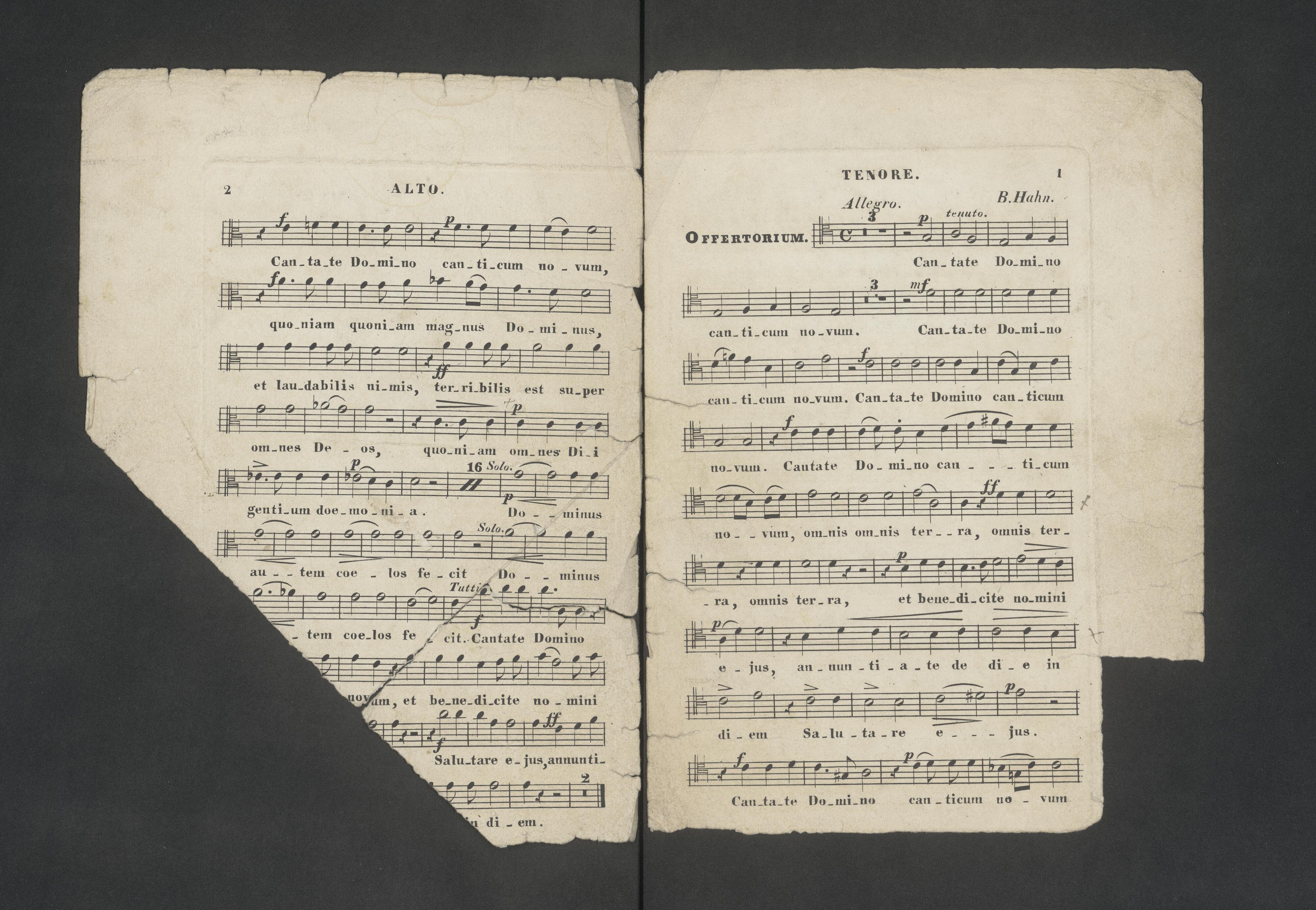 [cover title:] OFFERTORIUM | "Cantate Domino" | für 4 Singstimmen, | 2 Violinen, Viola, | 2 Oboen, 2 Horn, | 2 Trompeten, Pauken ad lib, | Orgel und Contrabass | von | BERNHARD HAHN. | [on the right:] Pr. 20 Sgr. Eingetragen in das Vereins Archiv. | BRESLAU | Eigenthum u. Verlag von F. E. C. Leuckart. | Stich u. Druck v. C.H. Westphal Breitestr 20