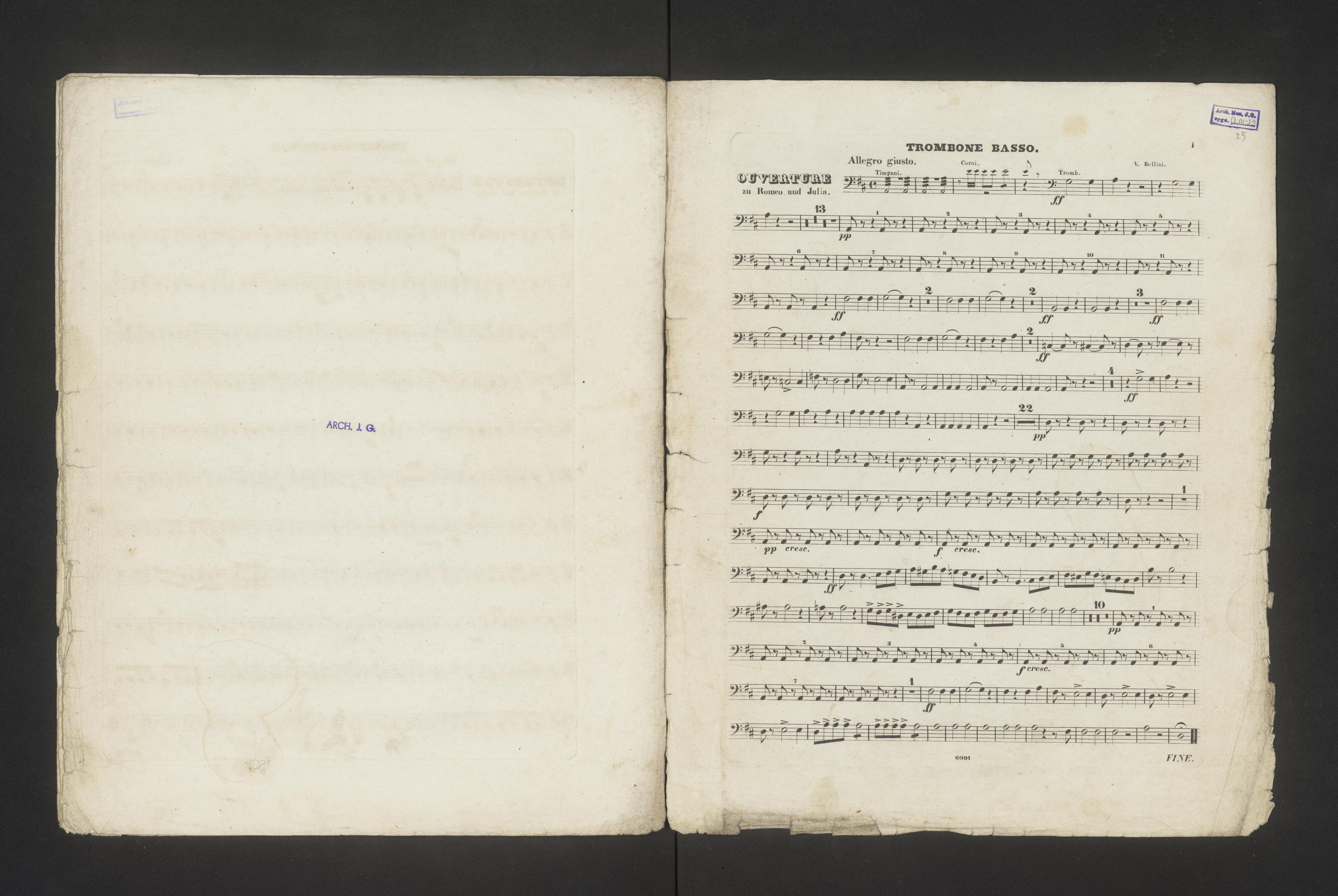 OUVERTURE | del Opera | I Mintecchi ed I Capuleti | (Romeo und Julia) | a Grand Orchestre | compose | PAR | V. Bellini. | N|o 6091. Propriete des Editeurs. Pr 2 Thlr. 8 Gr.| LEIPZIG, | chez Breitkopf & Härtel. | Milan, chez I. Ricordi. | Enrégistrè dans les Archives de l' Union