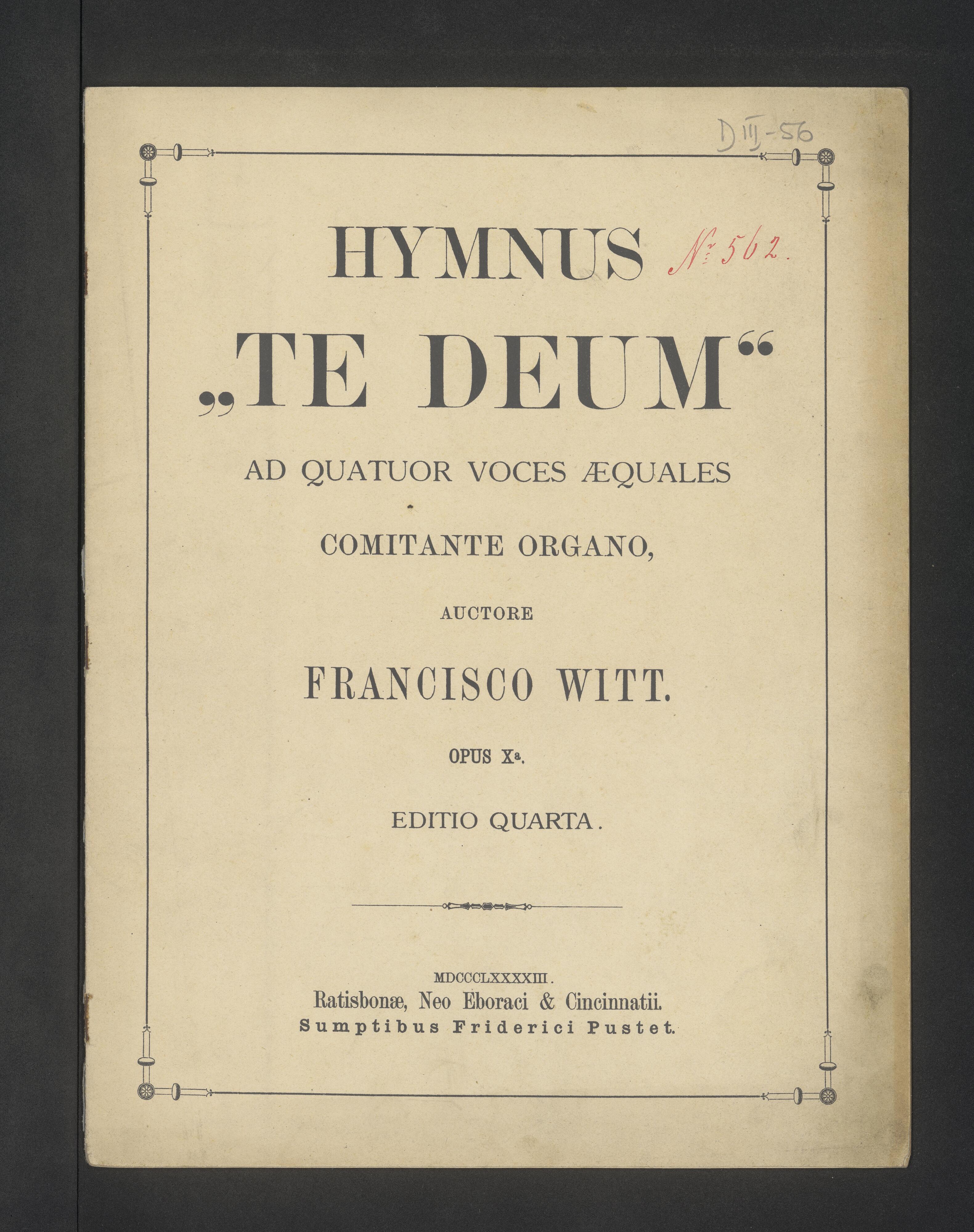 [cover title:] HYMNUS | "TE DEUM" | AD QUATUOR VOCES INAEQUALES | COMITANTE ORGANO, | AUCTORE [!] | FRANCISCO WITT. | OPUS X|a. | EDITIO QUARTA. | MDCCCXCIII. | RATISBONAE, NEO EBORACI ET CINCINNATII. | SUMPTIBUS FRIDERICI PUSTET, | S. Sedis Apostolicae Typographi