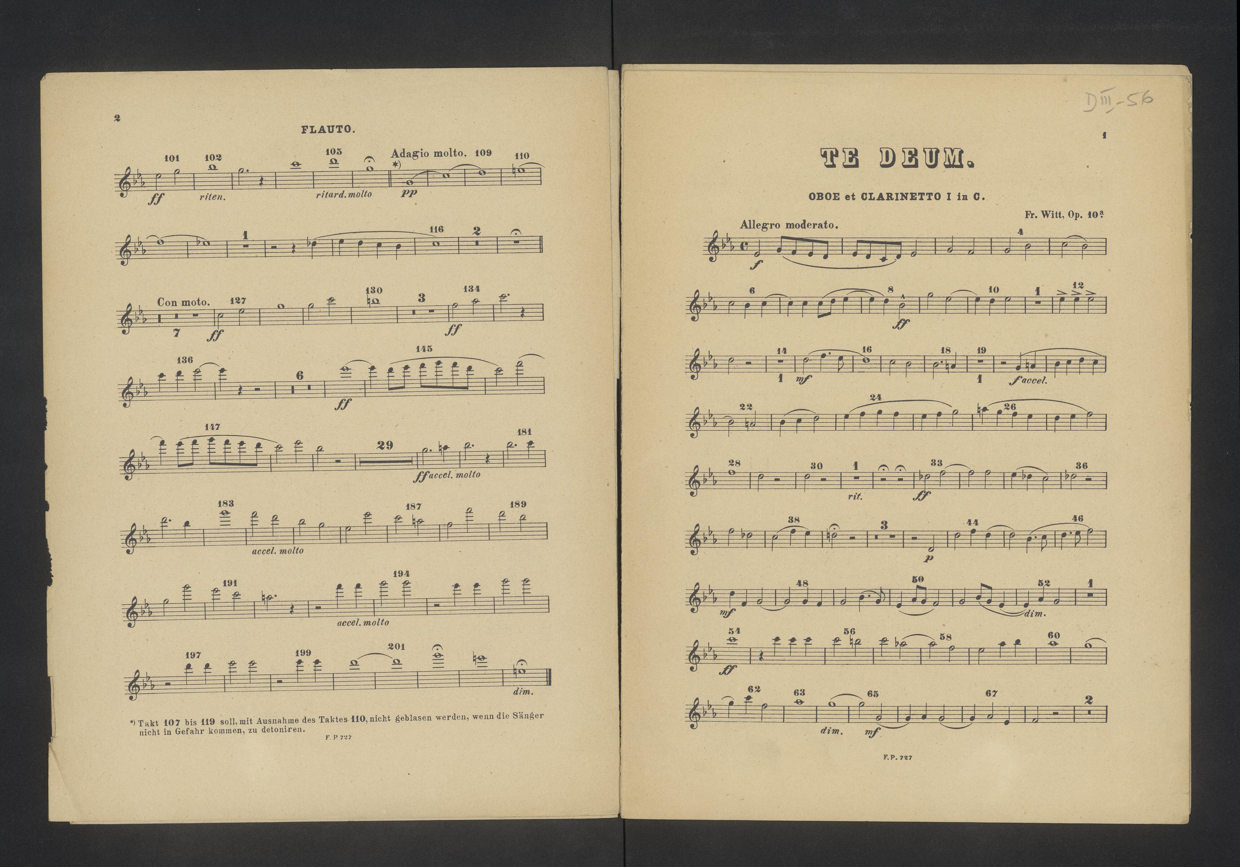 [cover title:] HYMNUS | "TE DEUM" | AD QUATUOR VOCES INAEQUALES | COMITANTE ORGANO, | AUCTORE [!] | FRANCISCO WITT. | OPUS X|a. | EDITIO QUARTA. | MDCCCXCIII. | RATISBONAE, NEO EBORACI ET CINCINNATII. | SUMPTIBUS FRIDERICI PUSTET, | S. Sedis Apostolicae Typographi