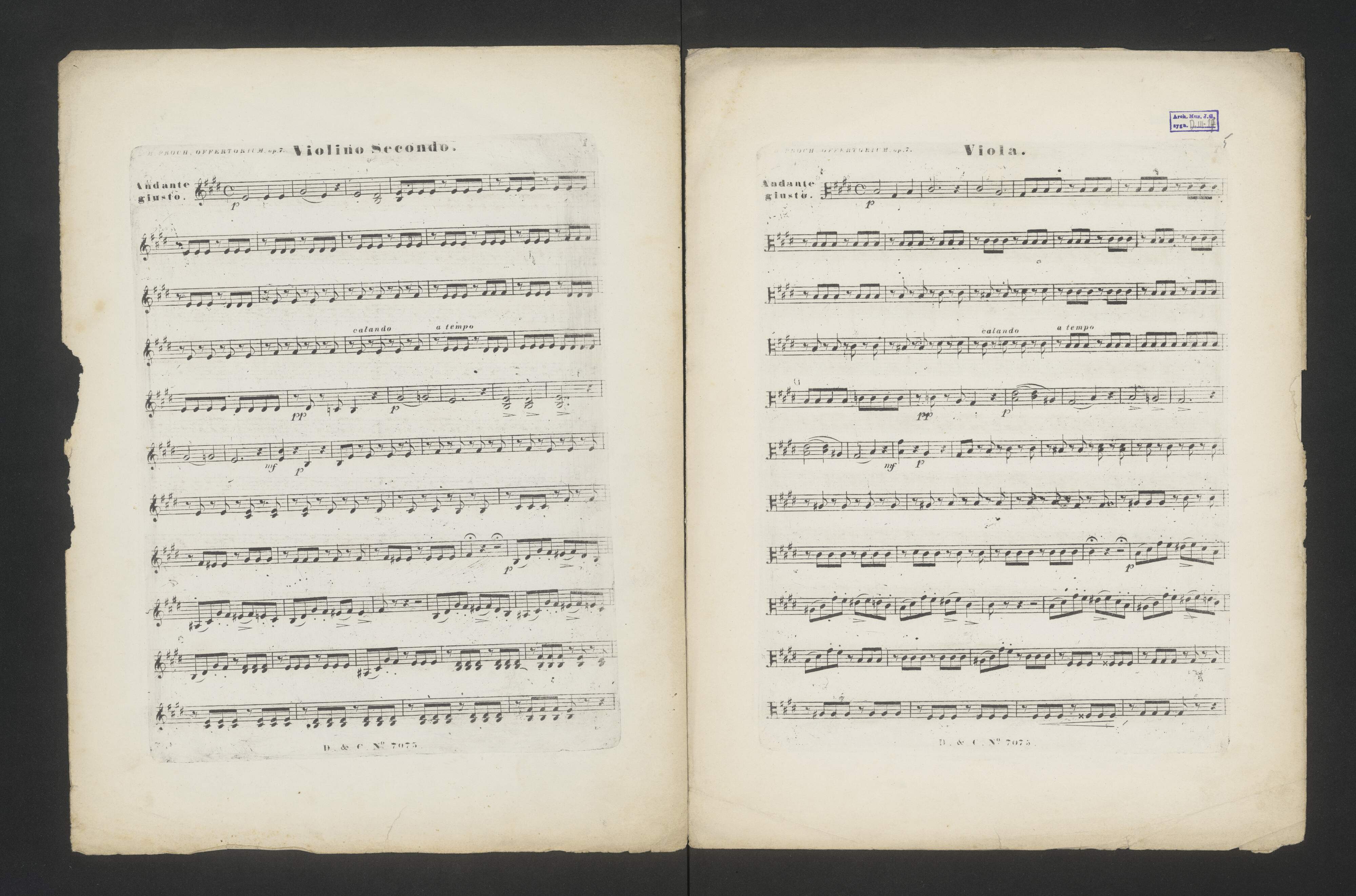 [title page:] OFFERTORIUM | (Ave maris stella) | für | SOPRAN oder TENOR | und | VIOLIN-SOLO | mit Begleitung | von 2 Violinen, Viola, Violoncell, Bass und Orgel oblig. | (2 Oboen oder Clarinetten Und 2 Horn ad libitum) | Componirt und seinem | Freunde und einstigen Lehrer | HERRN ANTON HERZOG / Director der k. k. Kreis-Hauptschule u. Regens Chori | IN WIENER-NEUSTADT | dankbar gewidmet | von | HINRICH PROCH | 7|t|e|s Werk. | [at left:] N|o 7075 [at right:] Pr. fl. I. 45 xr. C. M. | WIEN | C. A. Spina, k. k. Hof- u. priv. Kunst- u. Musikalienhandlung | Graben N|o 1133