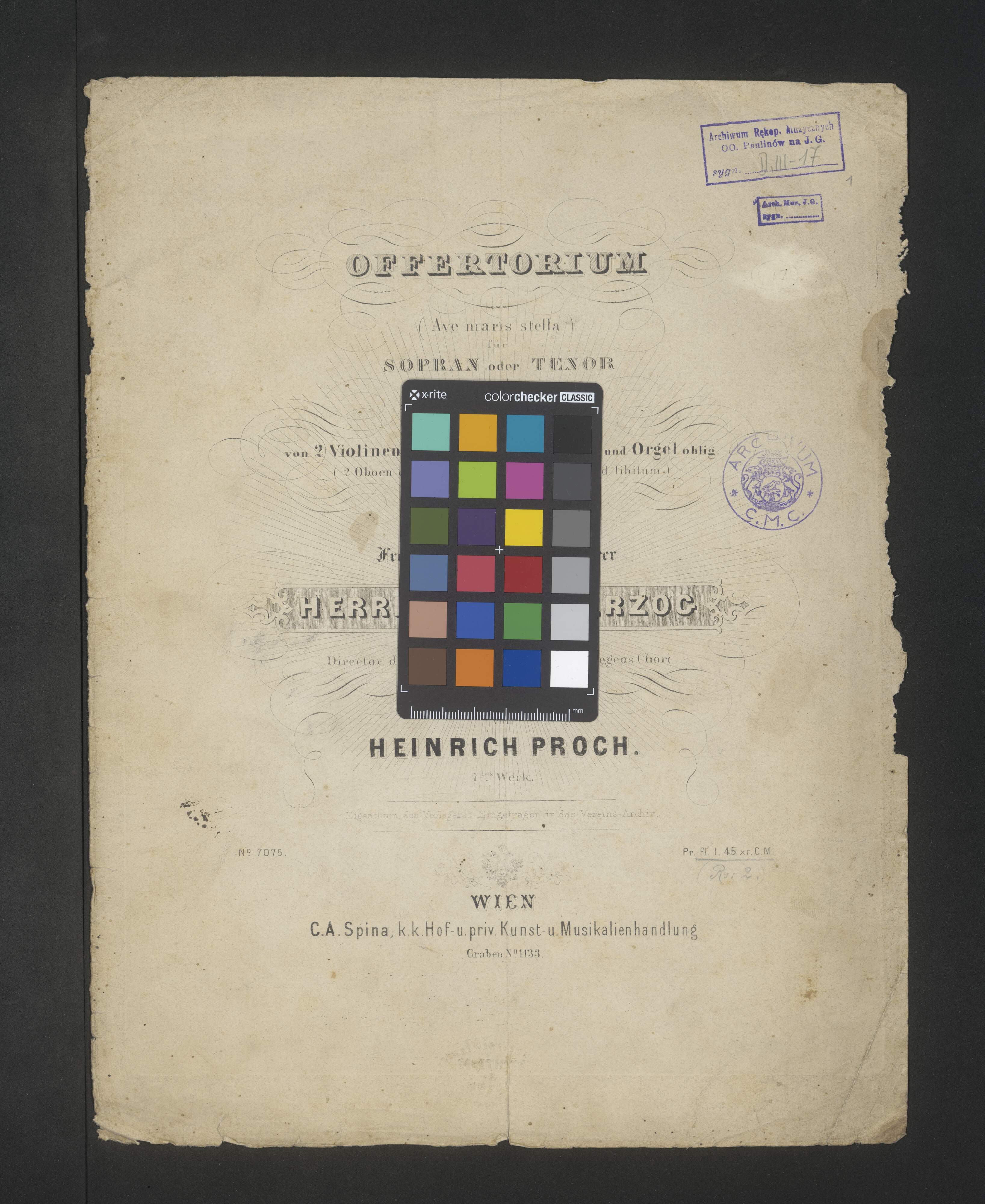 [title page:] OFFERTORIUM | (Ave maris stella) | für | SOPRAN oder TENOR | und | VIOLIN-SOLO | mit Begleitung | von 2 Violinen, Viola, Violoncell, Bass und Orgel oblig. | (2 Oboen oder Clarinetten Und 2 Horn ad libitum) | Componirt und seinem | Freunde und einstigen Lehrer | HERRN ANTON HERZOG / Director der k. k. Kreis-Hauptschule u. Regens Chori | IN WIENER-NEUSTADT | dankbar gewidmet | von | HINRICH PROCH | 7|t|e|s Werk. | [at left:] N|o 7075 [at right:] Pr. fl. I. 45 xr. C. M. | WIEN | C. A. Spina, k. k. Hof- u. priv. Kunst- u. Musikalienhandlung | Graben N|o 1133